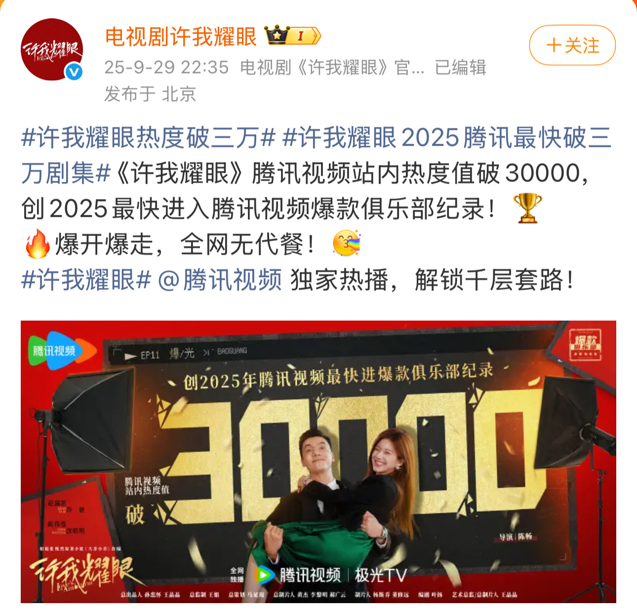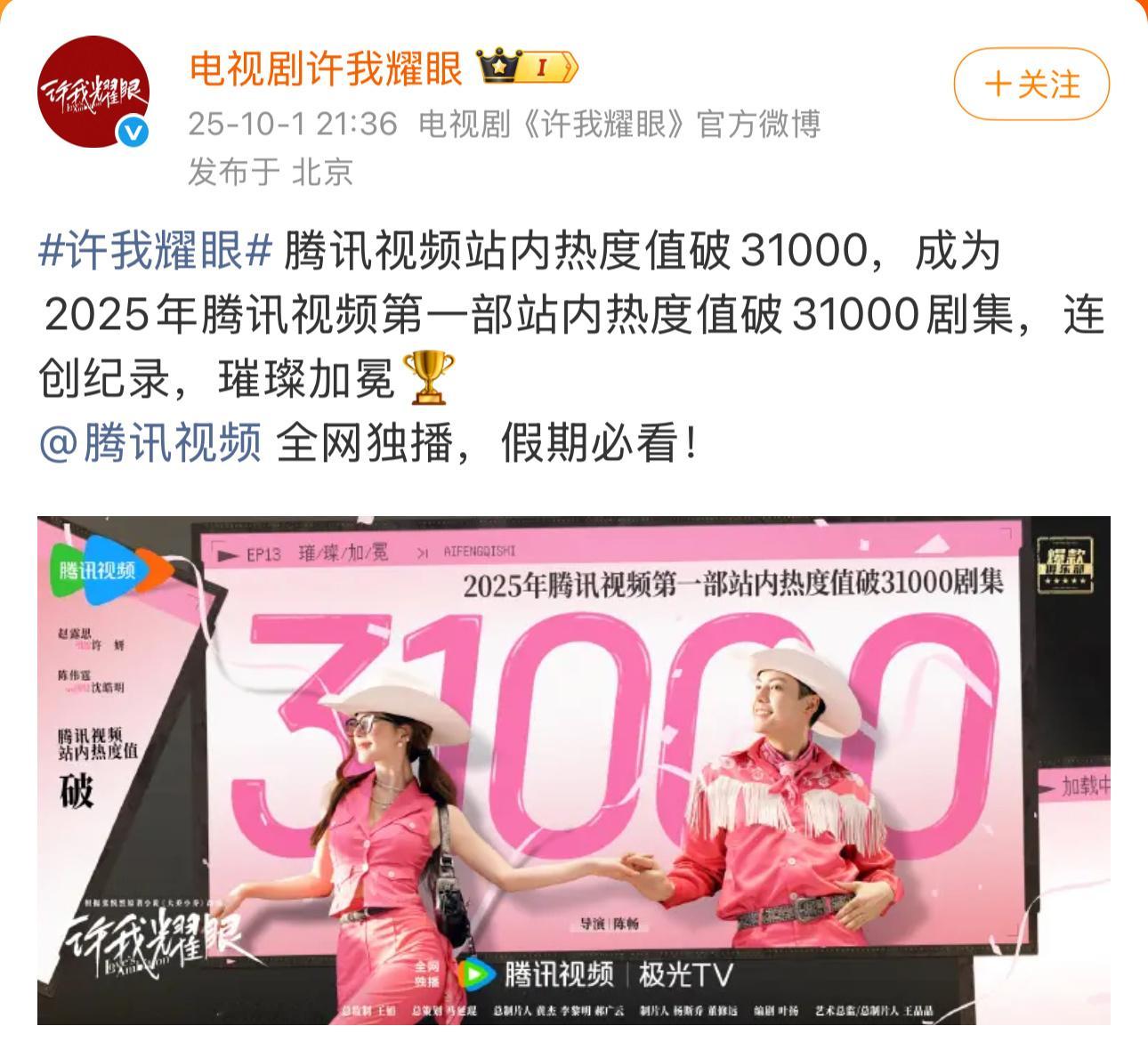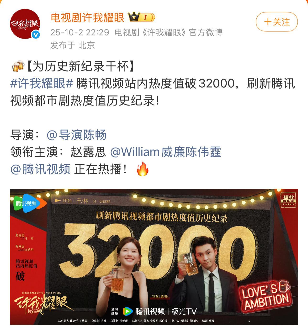 许我耀眼热度突破32000赵露思新剧《许我耀眼》开播7天,腾讯站内热度值突破32000。真是天生顶流体质,接这颗小露的事业运!🤲