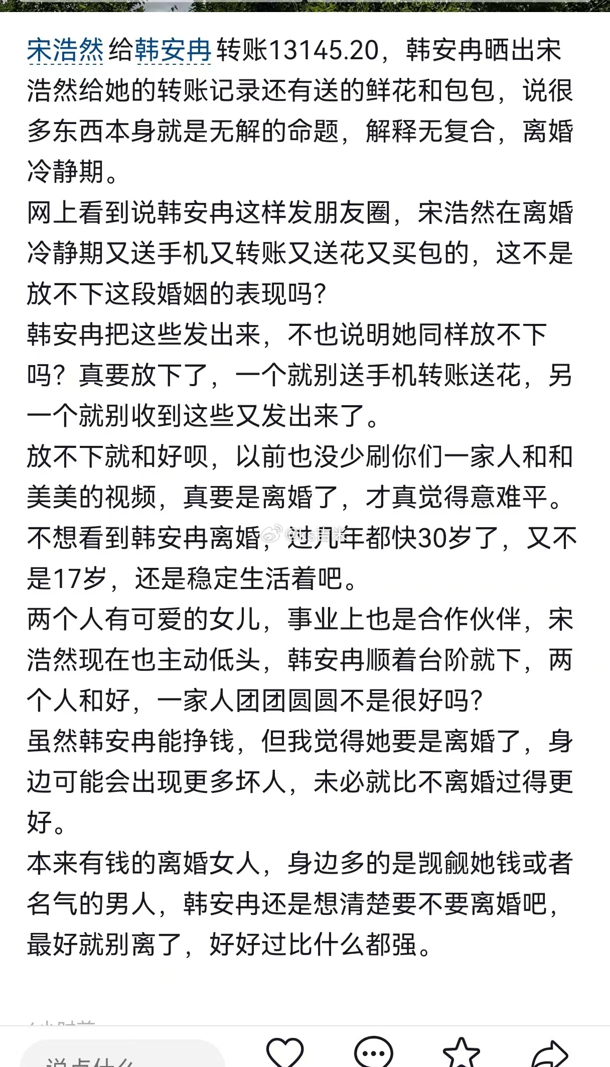 韩安冉粉丝发文表示不希望两人离婚,劝韩安冉马上30岁了,为了两个女儿还是稳定生活吧,宋浩然既然主动低头,韩安冉顺着台阶下,两人和好一家人团团圆圆不好吗?离婚了身边会出现更多坏人! 宋浩然想挽回跟韩安冉的婚姻