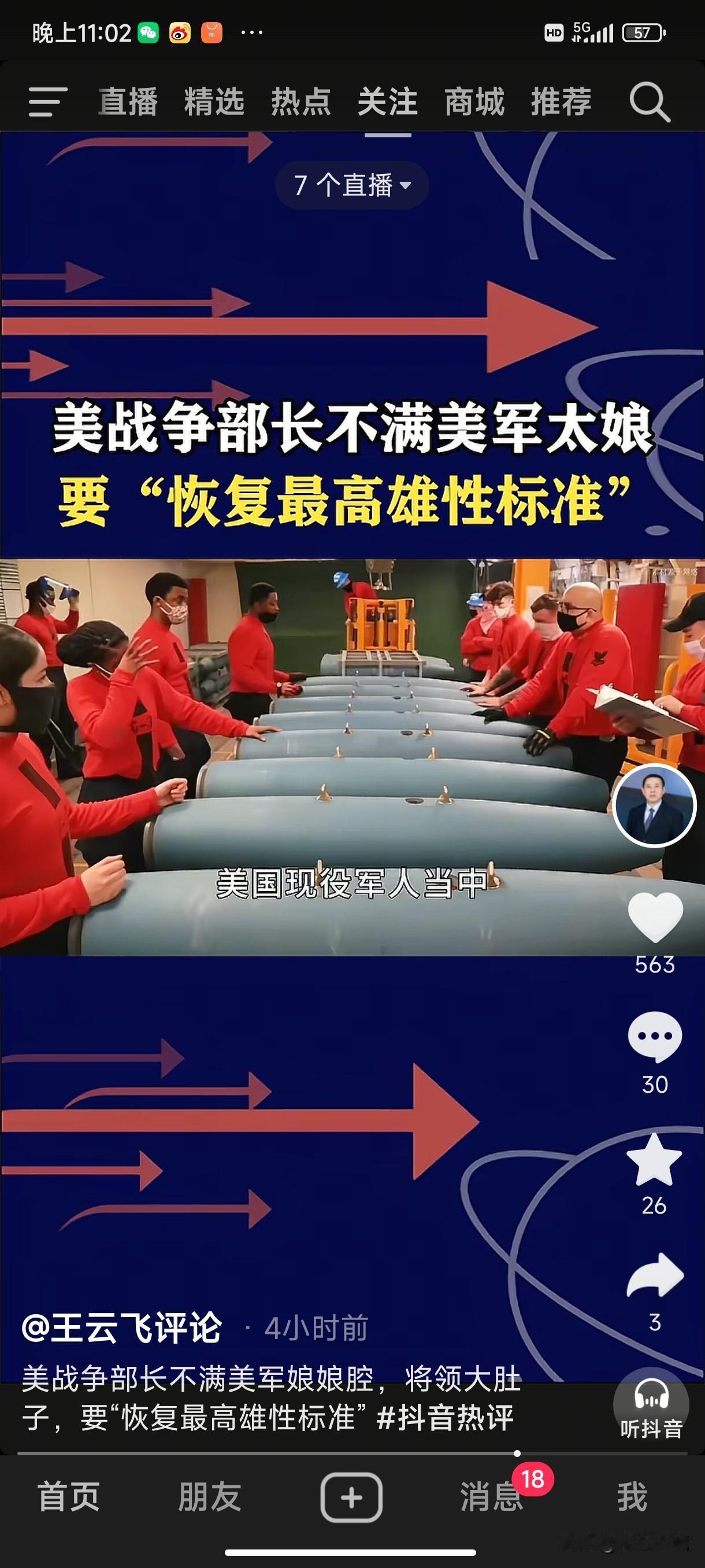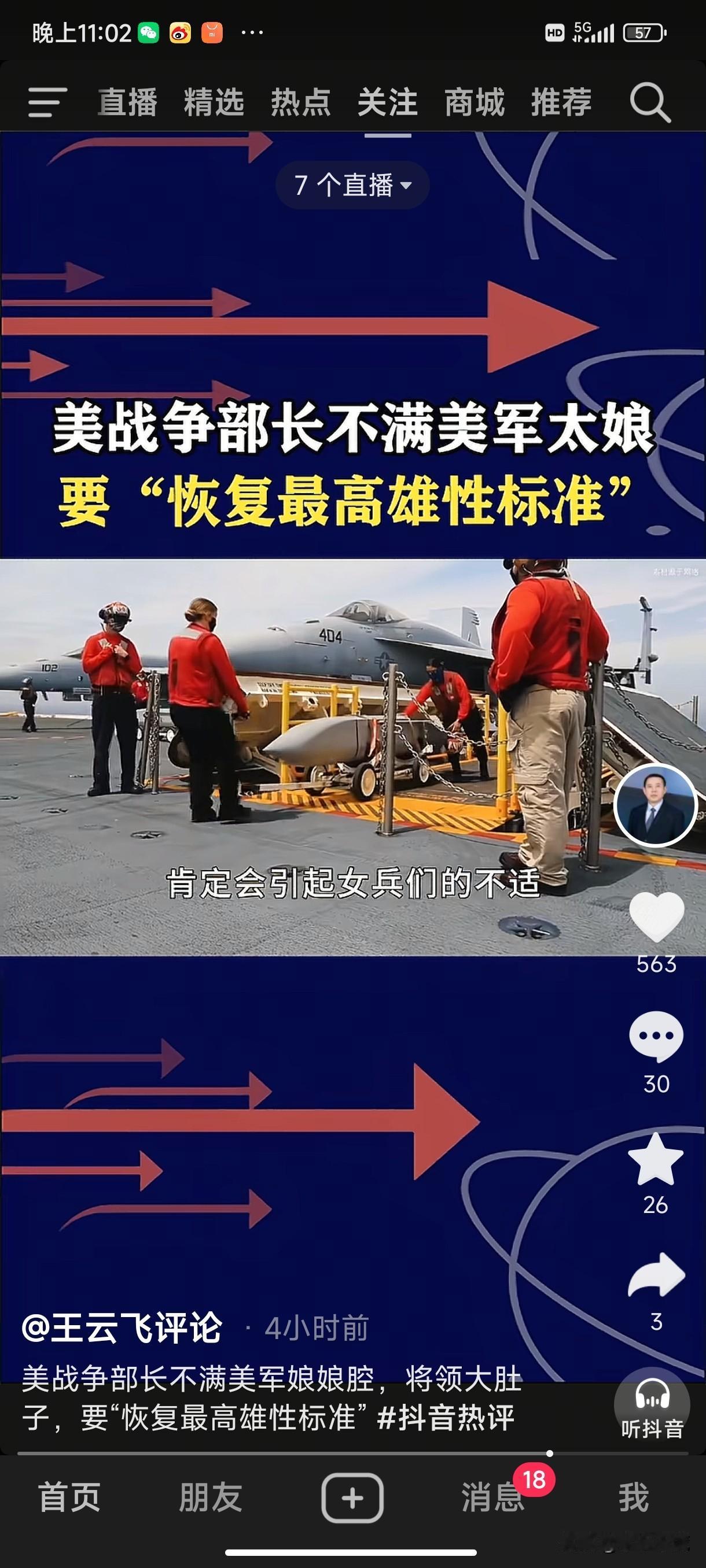 娘娘腔、大肚子、太娘们……这些美国军官地位不保了,很奇怪,美国战争部部长为什么会有这种“性别歧视”做法?难道他就是“最高雄性标准”吗?即使他有,也不能拿自己的标准去要求别人吧?这只不过是打着打着“标准”的幌子继续裁减部队领导机构而已。 大家看看这位部长简历就会明白了:前国民警卫队少校,最高军衔还没到中校,当了4年兵就去了健身房当健身教练,不知道为何入了特朗普的眼,摇身一变就成了美国战争部部长,他做过2件让人笑掉牙齿的事,一是“议员问他东盟十国是哪些,他支支吾吾答不上来,再问他国防战略是什么,他答非所问“我今早做了5组47个俯卧撑”,好家伙,这算数成绩也够优秀了。 对于健身情有独钟,这就是当今美国战争部部长的特点,因此,拿自己的“肌肉”要求美国军官的“肌肉”,这是满足自己的“小爱好”而已。 但这也仅仅是原因之一,也算不上是重要原因,真正的原因就是部队裁员,当然这也是特朗普的意思,但是特朗普没说“不喜欢娘娘腔”军官,只是说“不支持他的可以卷铺盖走人”。 这样的决定确实是涉嫌“性别歧视”了。 目前,这样的决定已经引发美国军官的强烈不满,思维方式简单,治军能力薄弱,领导方式粗暴,这就是美国军官对赫格塞思的共识。 当然,他的决定是否能够实施下去,也是未知数。 这样的“战争部部长”,美国军队肯定是会显示“雄性”之美的,让我们拭目以待。