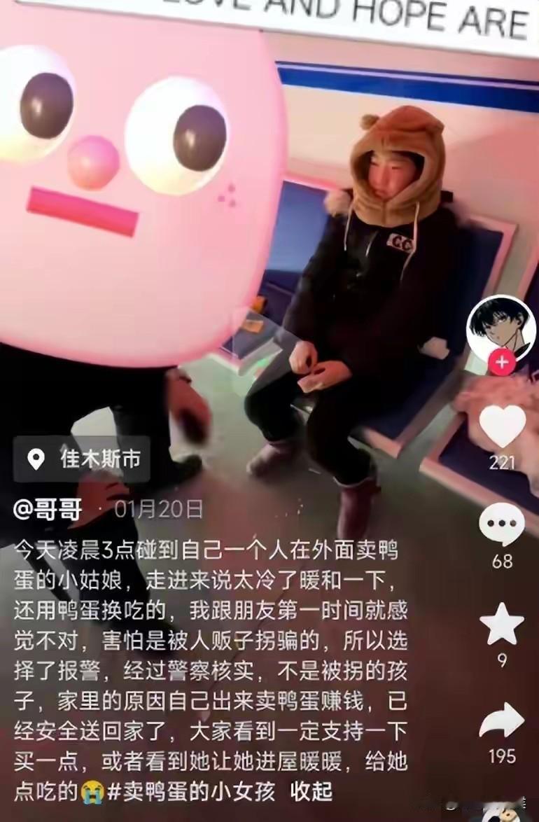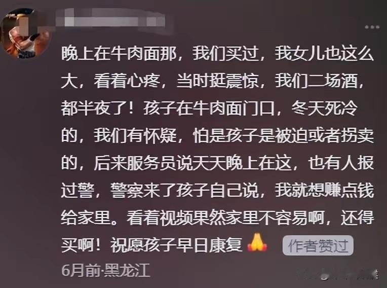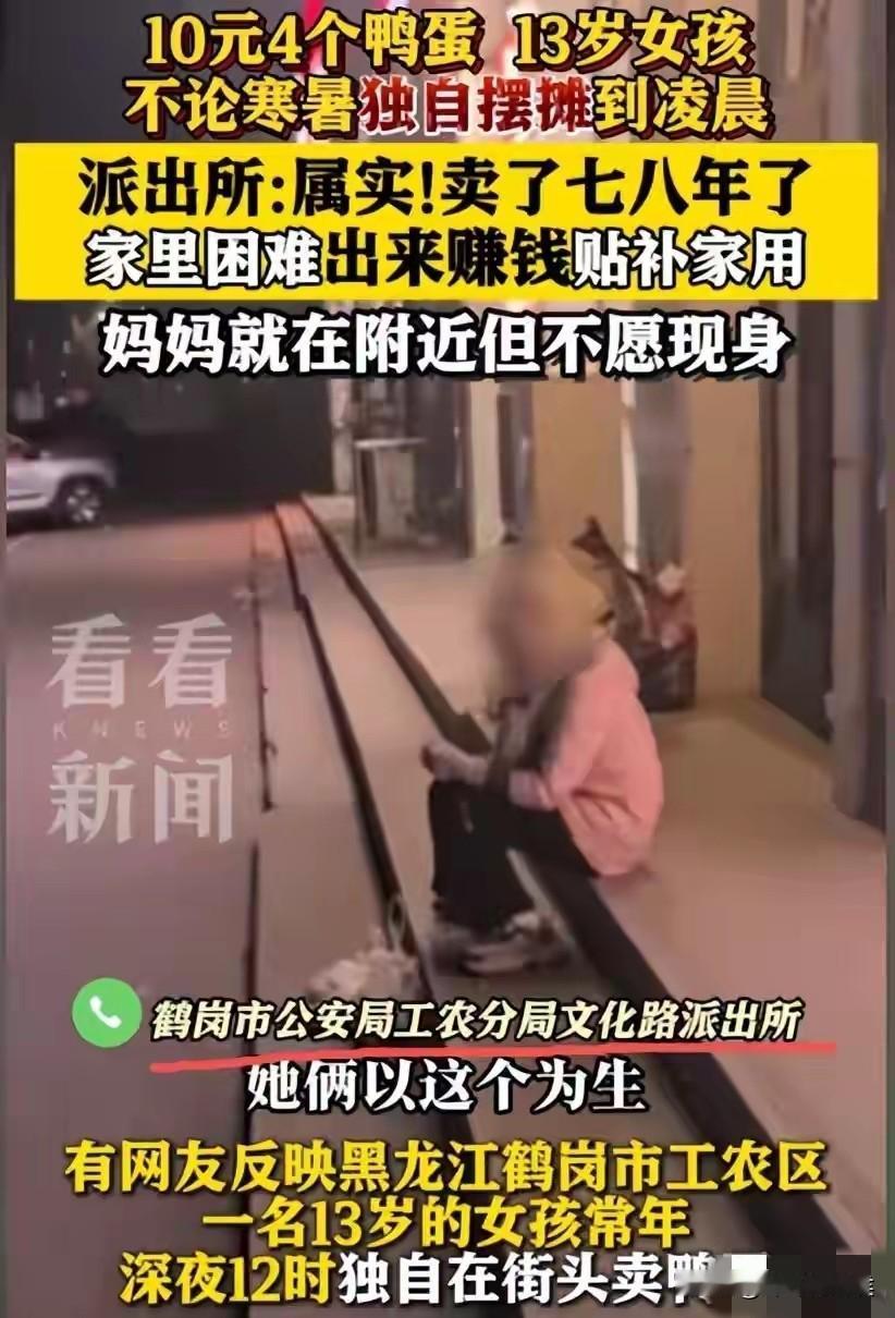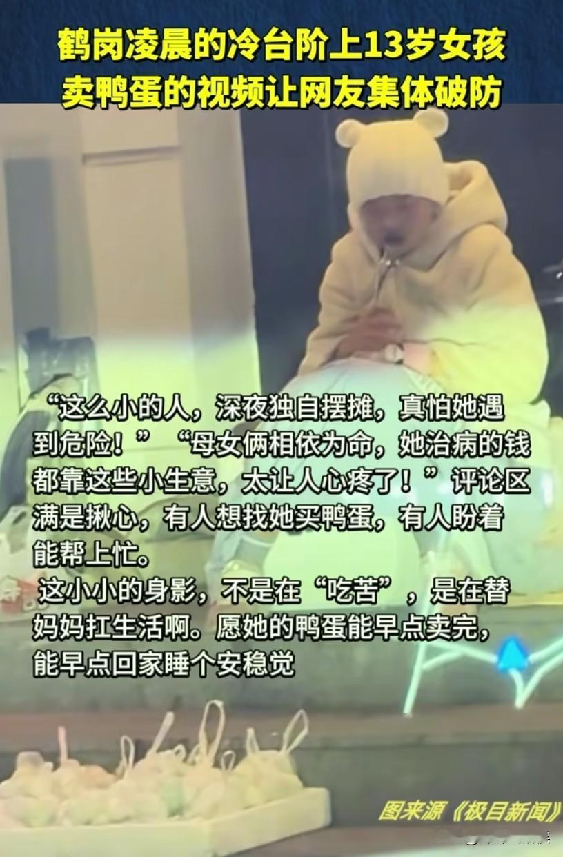 这个13岁小女孩,身世太可怜了! 被父亲抛弃,和母亲相依为命,出生查出心脏病,17点放学就去卖鸭蛋,凌晨24点才收摊,当地警方发声。 近日,很多媒体都转载了这样一条新闻,黑龙江鹤岗有个小女孩深夜还在卖鸭蛋,网友担心她的人身安全,这才拍了视频发到网上,没想到引发网友们的热议! 在国庆期间刷到这个新闻,说实话心头不是个滋味,她才只有13岁,别人家的孩子都在想着去哪里玩,这个小孩却在熬夜补贴家用。 路灯下,她坐在一家店门口独自摆摊的模样,像极了课本里的“卖火柴的小女孩”,不同的是,一个卖的是火柴,一个地上平整放着售价10元钱4个鸭蛋的袋子。 媒体对事件进行深入了解后,让人没想到的是,该事件背后还有不为人知的一面。 原来,这些年小女孩不光卖鸭蛋,偶尔也会卖一些鲜花和小乌龟,母亲目前也没有正式工作,两个人几乎就靠小女孩卖鸭蛋补贴家用。 当地派出所也出来回应了,女孩从五六岁就开始摆摊,已有七八年了,和母亲的相依为命,平时她们生活确实很困难,而他母亲平时就在附近,不愿意现身。 据民警说,如果她母亲在身边,这个鸭蛋就很难卖得出去,而小女孩独自卖鸭蛋,反而能卖得掉。 网友还找到了以前小女孩被采访的视频,刚出生就有心脏病,母亲坦言“看病要花很多钱,孩子很懂事,帮忙攒着钱,希望未来可以进行手术。” 实话实说,这位叫欢欢的小女孩,她的童年太特别了,本该在父母的呵护下撒娇的年纪,却早早承担起了家庭的重担。 而她一天在外面独自卖鸭蛋5个小时,足以彰显女孩的坚韧和担当,她深知家庭的处境,却不退缩的态度让人敬佩。 与其说孩子命苦,倒不如说是她成长经历上的宝贵财富,既然躲不掉,那就去勇敢面对! 大家怎么看这件事?