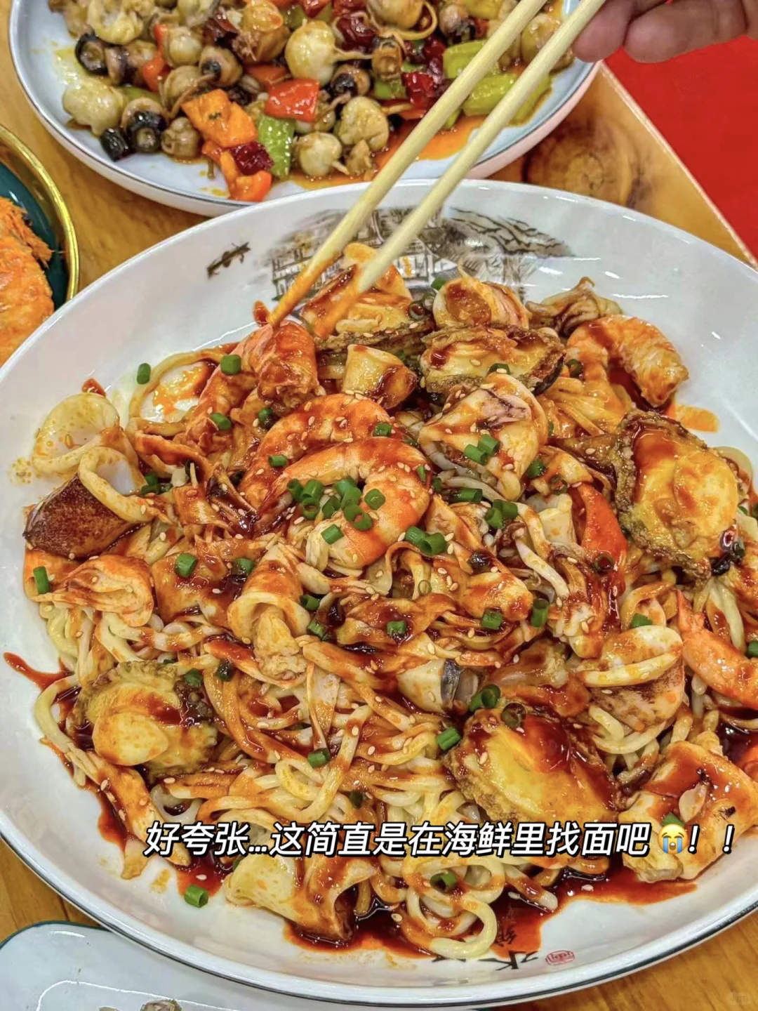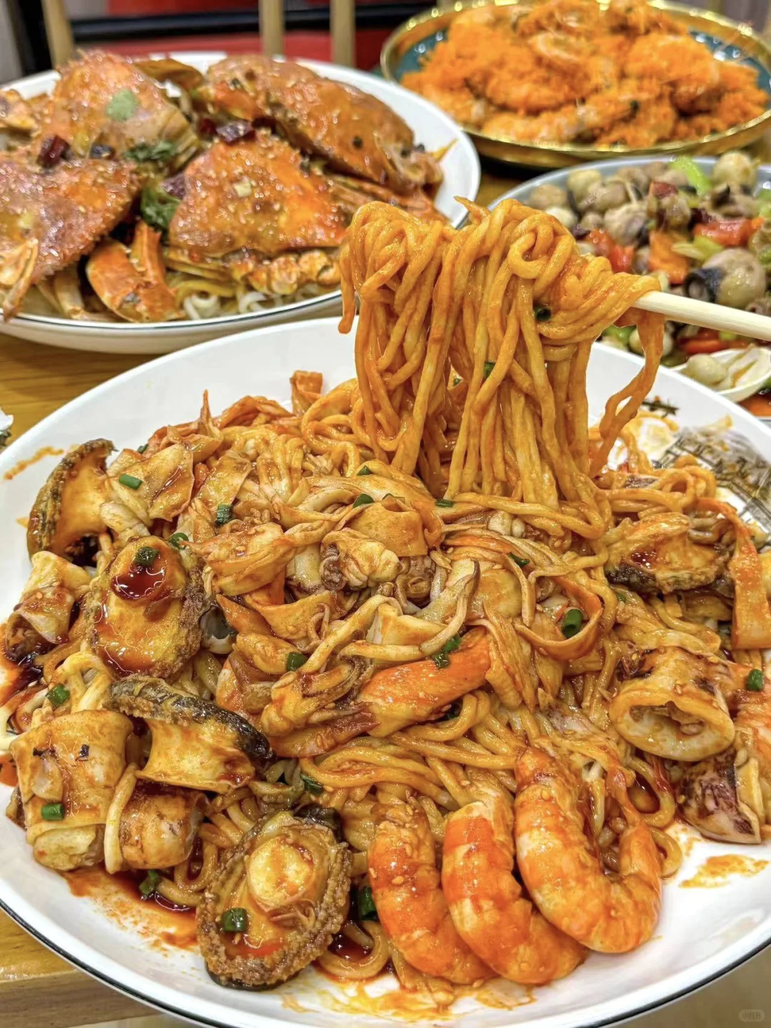 强推这个一品海鲜面🍜!!面条挂满酱汁好入味!里面还有鲍鱼、大虾仁🍤、比管鱼、蟹肉…料多到不行!