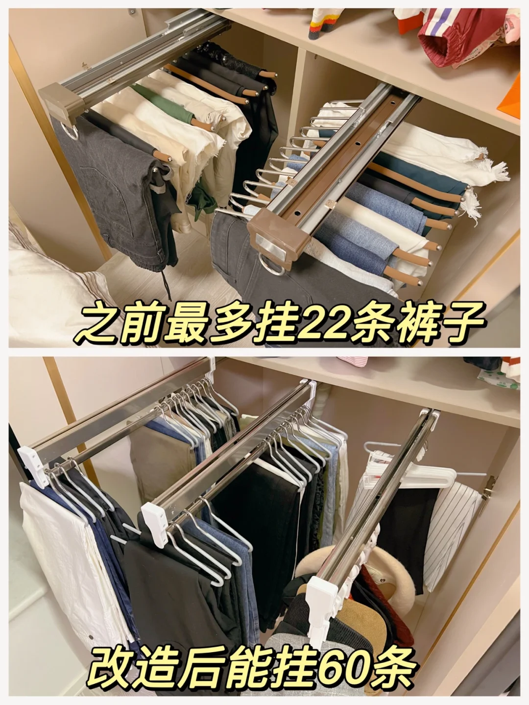 尽量做竖排抽拉裤挂,不要选择固定裤挂的滑轨,否则不好拿取,非常推荐图7-8的样式,亲测实用,那是我自己改造的,真的好用哭了;