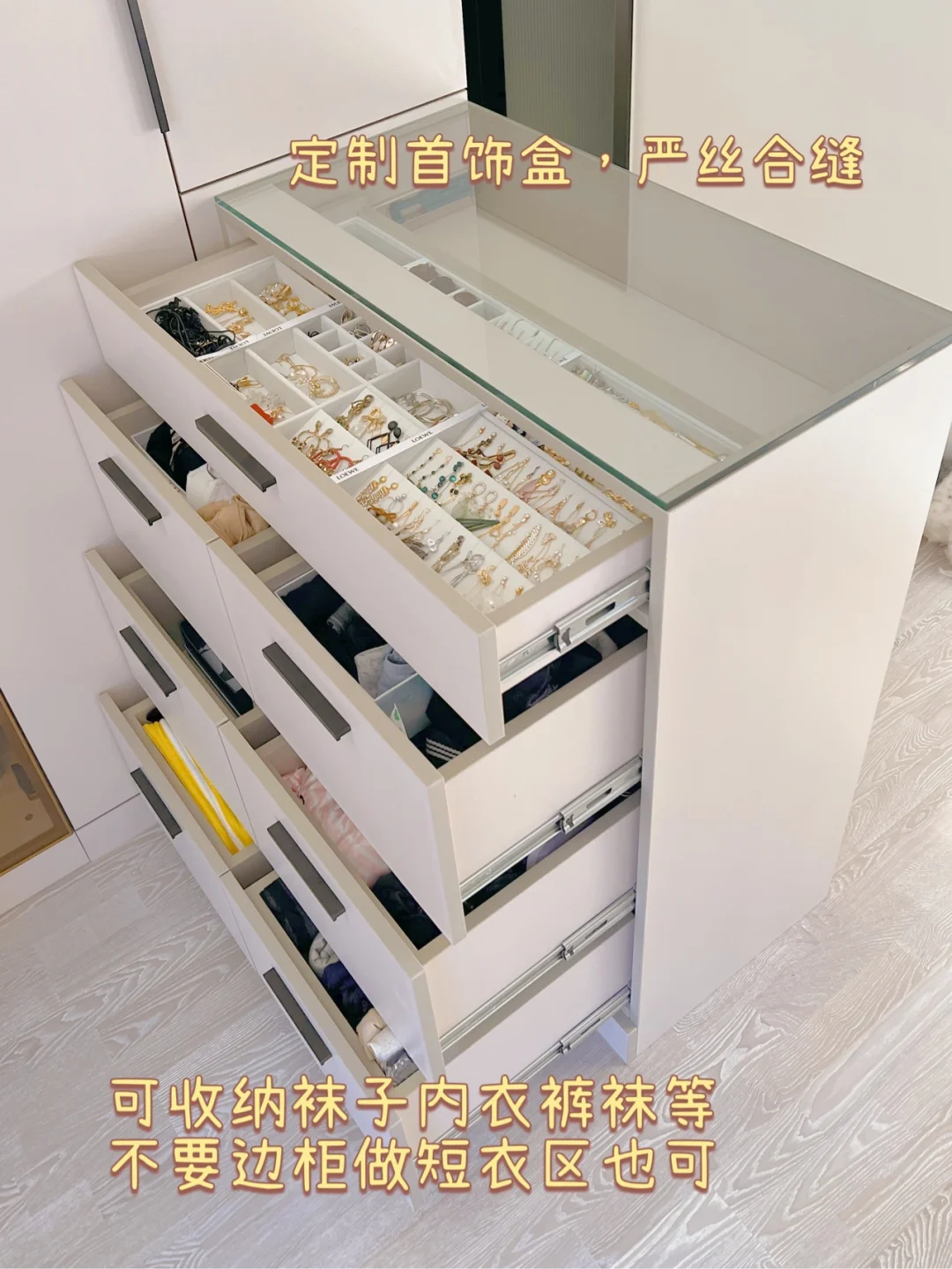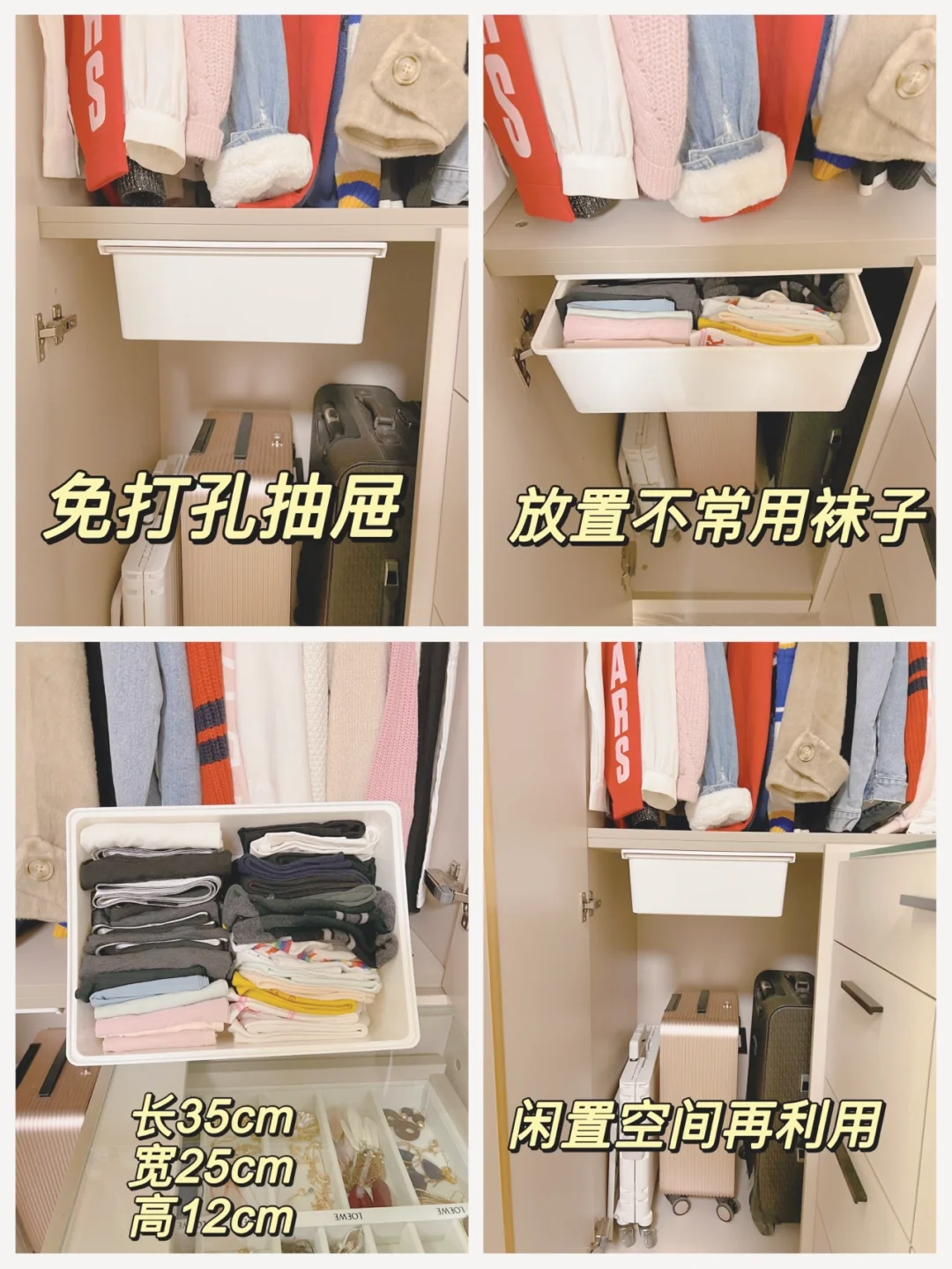 上层层板或柜门都可以放置免打孔抽屉,图6的抽屉可以放30双袜子,不常用的放里面不占空间还好拿取;