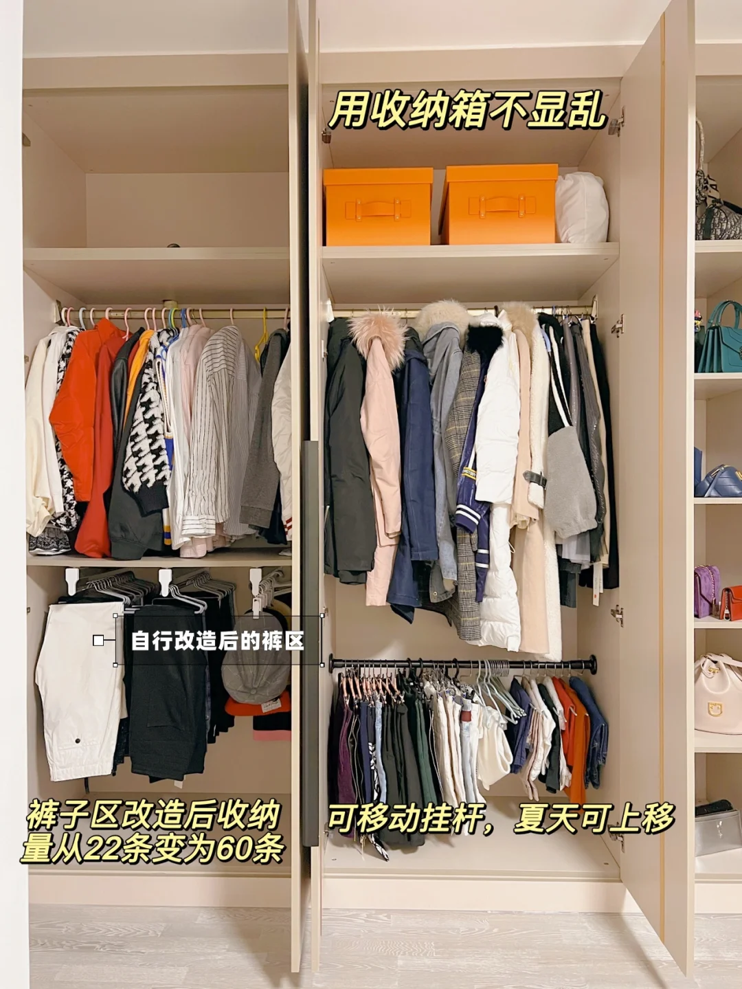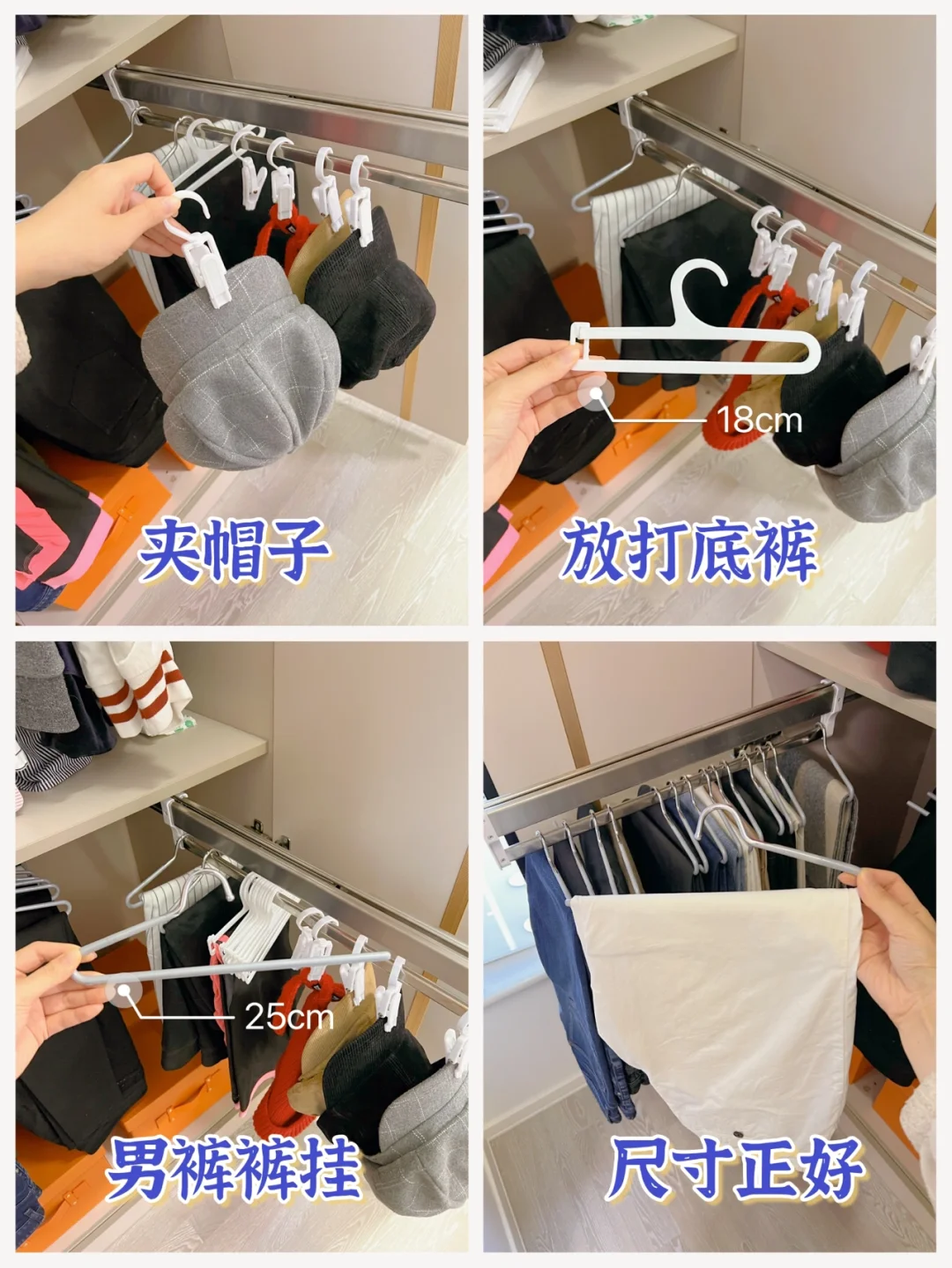 3⃣️裤子区:高度留75cm正好合适,严丝合缝的尺寸,下面还有空间的话放一个可移动抽屉也很方便;