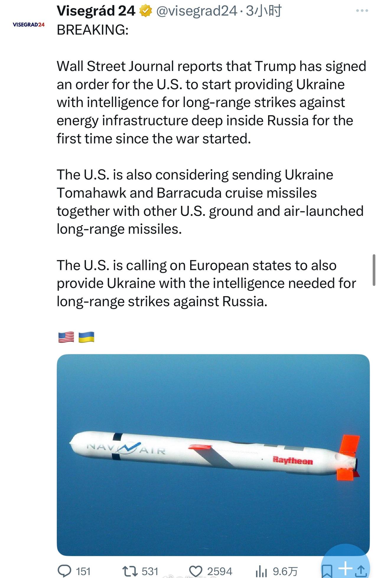 意想不到 据《华尔街日报》报道,特朗普已签署命令,要求美国自战争开始以来首次向乌克兰提供针对俄罗斯境内能源基础设施进行远程打击的情报。 以前美国给乌克兰的情报,顶多是战场上俄军的部署位置,现在直接瞄准俄本土的能源设施,等于把 “靶子” 画好了递过去。 乌克兰早就想打这些目标了,9 月底刚用导弹炸了俄罗斯巴什科尔托斯坦的石油化工厂,那厂子一年能加工 1000 万吨石油,还是俄液体火箭燃料的主要产地,炸完之后大火烧了一整天都没灭利索。 还有伏尔加格勒的石油泵站,是俄南部原油运输的关键节点,也被乌军用导弹毁了,导致周边几条输油管道都停了工。这些袭击能成,背后肯定有西方情报支持,现在美国干脆明着给,接下来俄境内的能源设施怕是要遭大罪。 “战斧” 巡航导弹这玩意儿,能飞 1000 多公里,带着 454 公斤的弹头,从乌克兰发射能直接打到莫斯科周边。之前拜登政府还不敢松这个口,怕局势失控,现在特朗普直接撕破脸。 要知道,去年 11 月拜登刚松口让用 ATACMS 导弹,乌克兰第二天就炸了俄布良斯克州的武器库,虽然大部分导弹被拦截了,但已经把冲突线拉到了俄本土。现在要是 “战斧” 真送过去,俄境内的油田、气站、输油管都得暴露在打击范围内,这可不是小打小闹。 美国自己拱火还不够,还逼着欧洲国家跟着干。可欧洲内部早就吵翻了天,匈牙利外长气得直骂,说这是 “极其危险”,搞不好要引发世界大战。 斯洛伐克总理也急了,说这一下把和平谈判的希望全毁了,欧盟根本没自己的主见,全跟着美国跑。德国总理朔尔茨更直接,说打死也不支持,不能把德国卷进战争里。 也就法国、英国还跟着起哄,英国之前就给了 “风暴之影” 导弹,乌克兰立马用它炸了俄境内目标,现在美国又拉着欧洲递情报,这是要把欧洲绑上战车啊! 实际上,美国这么干,根本不是为了乌克兰,全是自己的小算盘。一方面是对俄罗斯的 “挫败感”,之前特朗普跟普京通话没谈拢,就想靠打能源牌逼俄让步。 另一方面是想让欧洲 “买单”,就像之前送 “爱国者” 导弹,逼着德国、希腊掏钱,自己坐收渔利。还有就是中东那边暂时消停了,能腾出手来折腾东欧,典型的 “哪里有乱子就往哪拱火”。 对此,俄罗斯早就放话了,要是乌克兰用西方导弹打本土,就算 “美国直接参战”,冲突性质就彻底变了。普京前不久刚更新了核威慑政策,明确说要是无核国家在有核国家支持下打俄罗斯,就视为联合攻击,能用水核武器回应。 这话可不是吓唬人,之前乌克兰无人机炸到莫斯科郊区,俄立马就炸了乌的多个电力设施,让乌全境大面积停电。要是真炸了俄的能源命脉,俄的报复绝对会更狠。 2022 年冬天,俄反击炸了乌的电网,乌克兰有 1400 多万人没暖气、没电灯,零下十几度的天只能裹着被子过冬。要是现在俄的能源设施被打,国际油价、气价肯定要疯涨,2022 年冲突刚爆发时,油价一下涨到每桶 130 美元,咱们国内加油都贵了一块多。而且欧洲更惨,去年冬天因为气价涨了 10 倍,不少老人舍不得开暖气,冻得进医院,要是冲突再升级,这日子没法过了。 更让人揪心的是,这事儿根本看不到头。乌克兰缺兵缺得厉害,就算有导弹有情报,没人操作也白搭,美国自己都承认这是 “所有武器都解决不了的难题”。 可美国不管这些,一门心思要耗死俄罗斯,把欧洲拖进来当炮灰。匈牙利外长说得对,这就是在 “玩火”,一旦控制不住,战火蔓延开,谁也逃不掉。 打仗从来没有赢家,遭殃的都是普通老百姓。美国递情报、送导弹,看似占了上风,实则是把全世界往危险的边缘推。真希望这些国家能醒醒,别再拱火了,和平谈判才是唯一的出路,不然最后倒霉的还是咱们这些想安稳过日子的普通人。