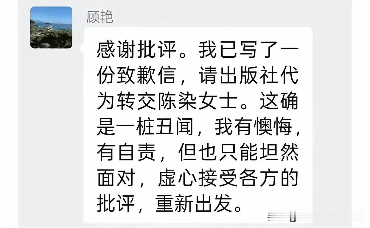 既然已经认定抄袭了,就大大方方道个歉,干嘛在这儿扭扭捏捏,遮遮掩掩,欲说还休的。 知名作家顾艳,已经被北美中文作家协会除名了。 虽然说作家协会除名,对她伤害不大,但是基本认定了抄袭这样一个事实。 看了她道歉的这几句话,轻描淡写的,对原作者的伤害根本没有坦诚的态度。 说陈染不接受,读者看了也很别扭。 就想问问你已经卖的那些书,得到的那些名誉,拿着不脸红吗?! 如果还有一些自尊的话,赶紧隐姓埋名吧,还重新出发,谁看啊?!