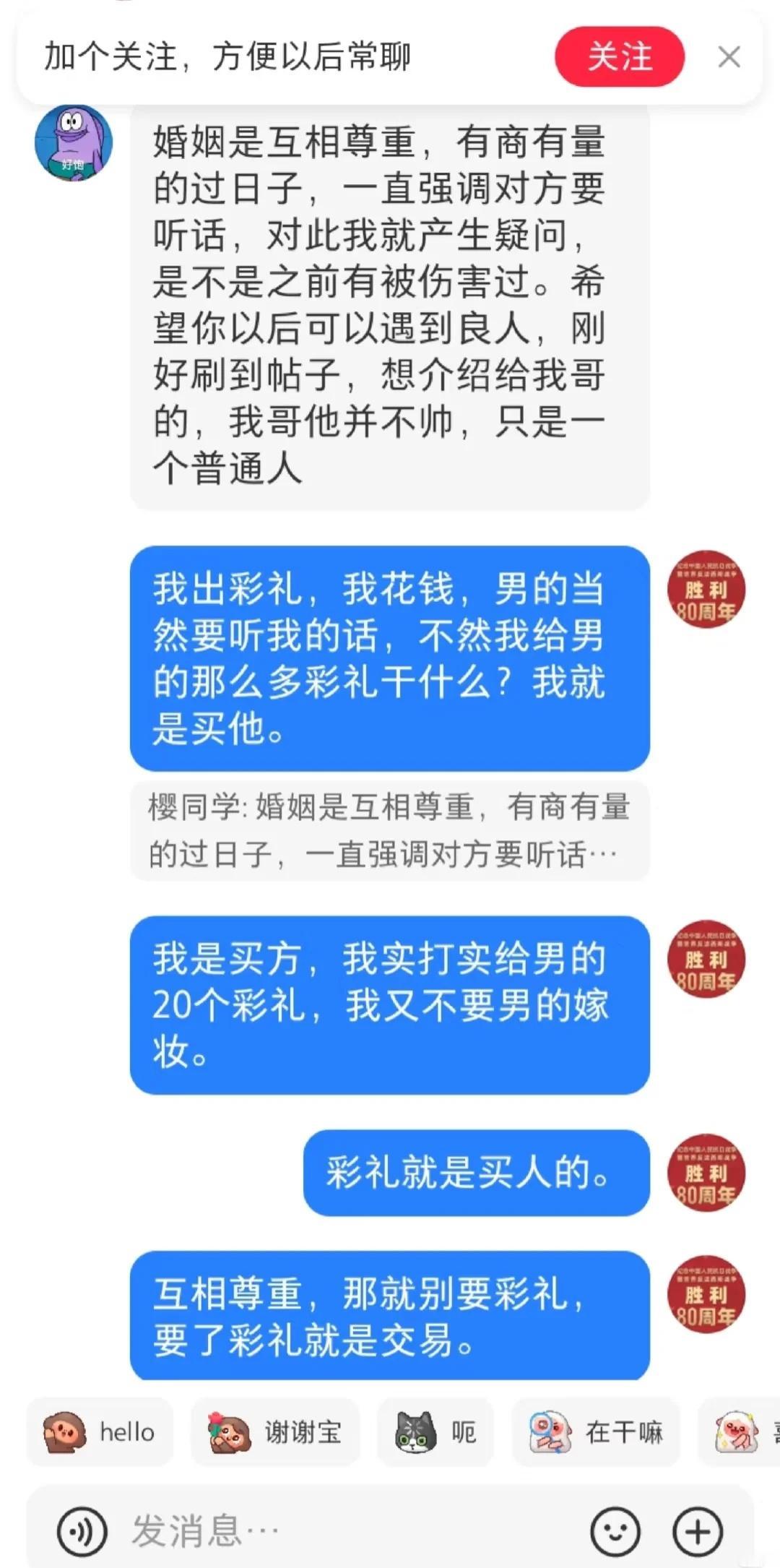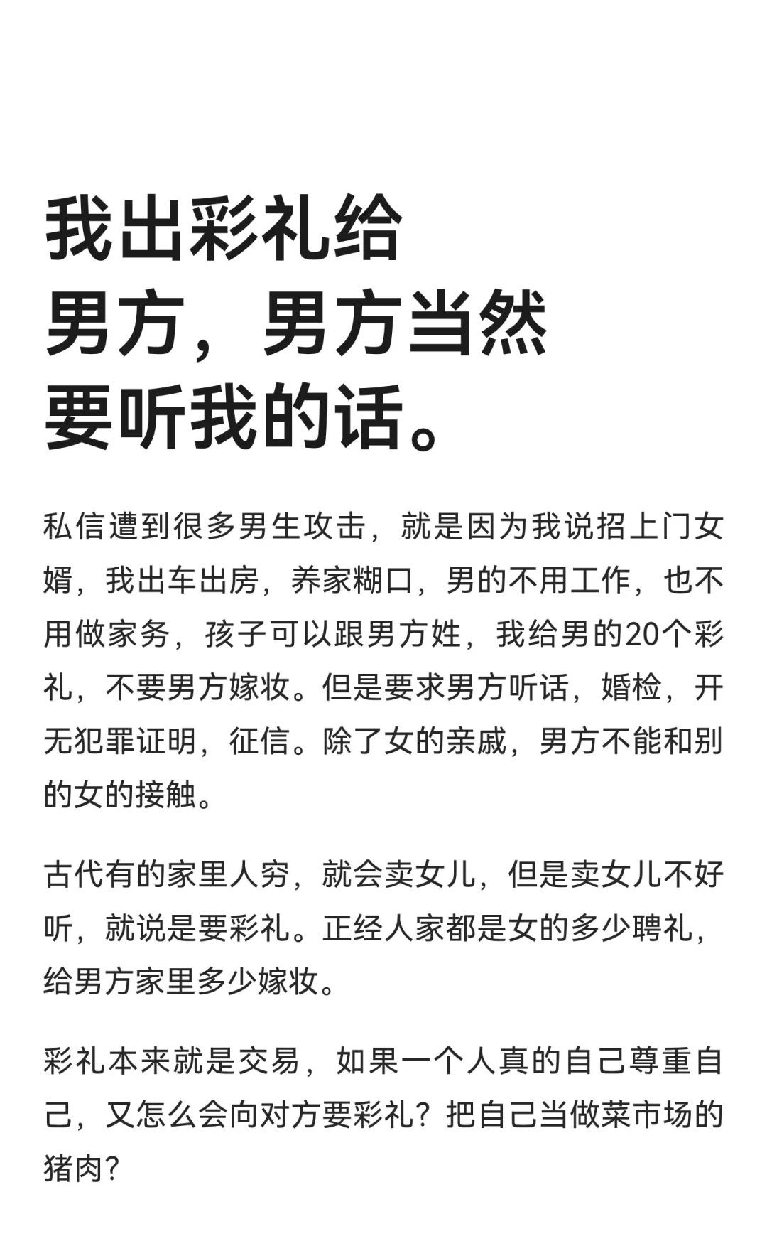 我出彩礼给男方,男方当然要听我的话。 彩礼结婚买房买车关于婚姻的价值观关于