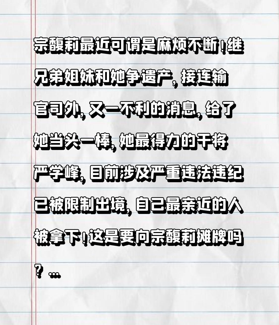 宗馥莉近来麻烦缠身! 先是兄弟姐妹与她争夺遗产,她接连输掉官司,如今又一则不利消息如晴天霹雳般袭来。她最为得力的干将严学峰,因涉及严重违法违纪,目前已被限制出境,自己身边最亲近之人被查处!这是要向宗馥莉摊牌吗?自古官商关系便难以长久维系!自宗庆后老爷子离世,娃哈哈就似那风中楼阁,摇摇欲坠,从未平稳前行。就当下这形势,究竟是谁造成的呢?宗馥莉还能继续掌控娃哈哈吗?种种不利迹象显示,她能否全身而退?宗馥莉小姐姐目前的处境着实不容乐观!祝她好运吧!宗馥莉公主 娃哈哈宗馥 宗馥莉公主 宗馥莉遗产争夺