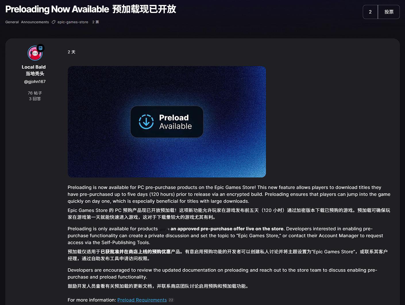 Epic Games 开发者 Local Bald 在商店官方论坛上宣布:“Epic Games 商店的 PC 预购游戏现在支持预载功能!”玩家可以在游戏正式发售前 最多提前五天(120 小时)下载加密版本。