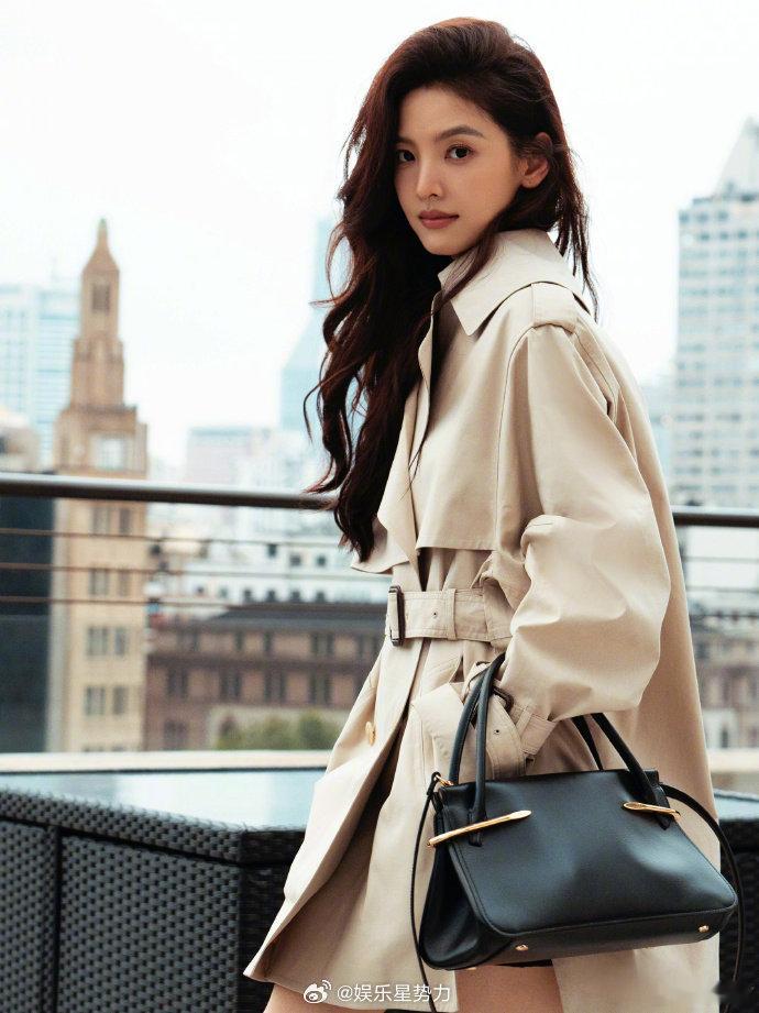 小麦色风衣与黑色皮革手袋的组合太经典,章若楠这身出发造型把简约单品穿出了高级感,