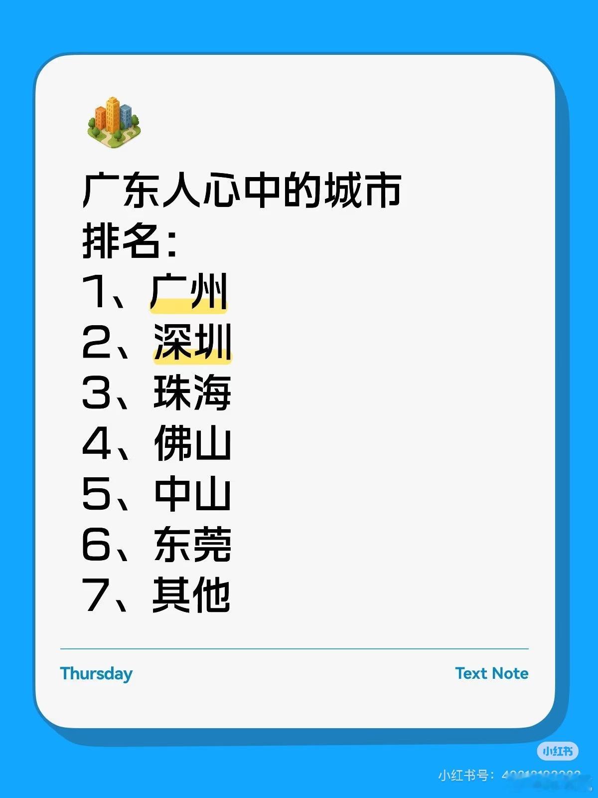 广东人心目中的各城市排名1、广州2、深圳3、珠海4、佛山5、中山6、东莞大家觉得
