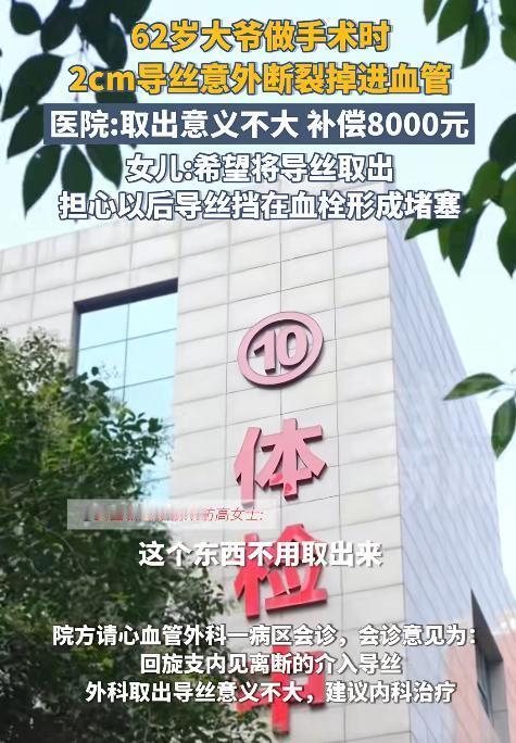 河南汝州,近日,62岁大爷做手术时,2cm导丝意外断裂掉进血管,女儿担心导丝挡在血栓形成堵塞,要求医院将导丝取出,可医院却回应:取出意义不大,补偿8000元!网友:8000块?这在国外得8000万! 高大爷年纪大了,平时也没什么大毛病,但最近总觉得胸口闷闷的,呼吸不如以前顺畅,家人见状,劝他去医院做个全面检查。 经过一系列化验和影像检查后,医生告诉他们,高大爷胸部有一点小问题,需要做手术,但手术不算复杂,风险也不高。 虽然医生再三强调手术安全可控,但家人还是难免担心,妻子小心翼翼地叮嘱,高大爷也有些紧张,心里七上八下。 手术当天,家里人几乎整个上午都在医院走廊里等着,时不时探头看看病房的方向。 好在手术顺利进行,整个流程下来没有出现任何意外,就是有2cm的导丝断裂掉进血管里了,医生的意思是,不会产生什么大问题,就不用取出来了。 好在手术总体顺利,胸部的小问题顺利解决,但在回顾手术记录时,医生发现有一根约2厘米的导丝在操作过程中意外断裂,留在了高大爷的血管里。 医生解释说,这种情况偶尔会发生,导丝本身是非活动性材料,通常不会影响血流,也不会引起严重并发症,因此不建议二次手术去取出,以免增加风险。 高大爷的女儿听后非常担心,她担心导丝可能成为血栓形成的障碍,一旦堵塞血管,后果不堪设想,她多次联系医院,要求采取措施,把导丝安全取出。 医院方面则坚持认为二次手术风险大,意义不大,反而提出可以给家属一次性经济补偿8000元,以示对意外情况的处理和善意。 沟通无效后,家属选择了向媒体求助,但是目前这件事双方还正在协商之中。 信息来源:封面新闻