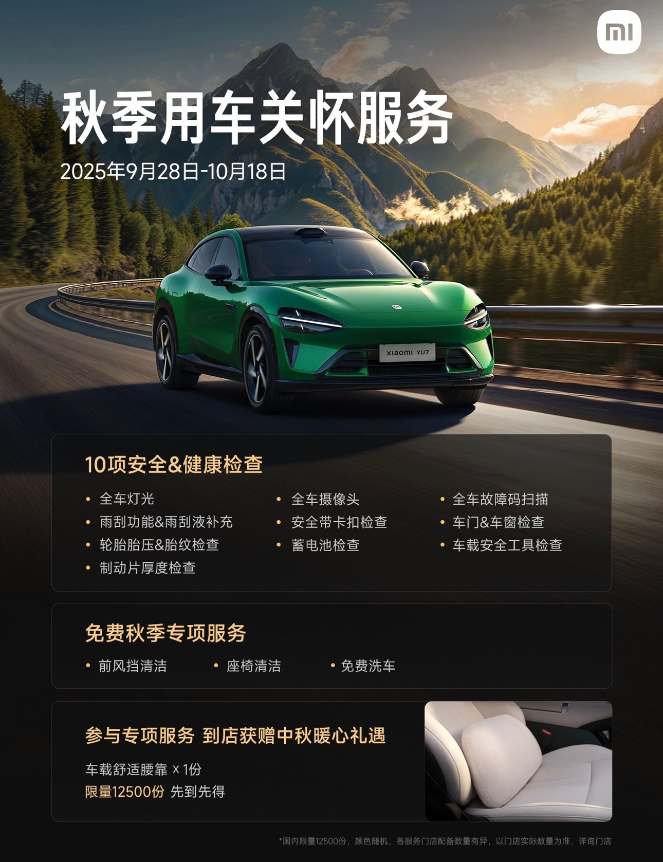 车友多了也不好,我看小米汽车的秋季用车关怀服务可以检查、洗车还可以清理座椅和前挡风玻璃内侧,还送个腰靠,现在我想给我的小米YU7约个服务但是最快得14号了[允悲]