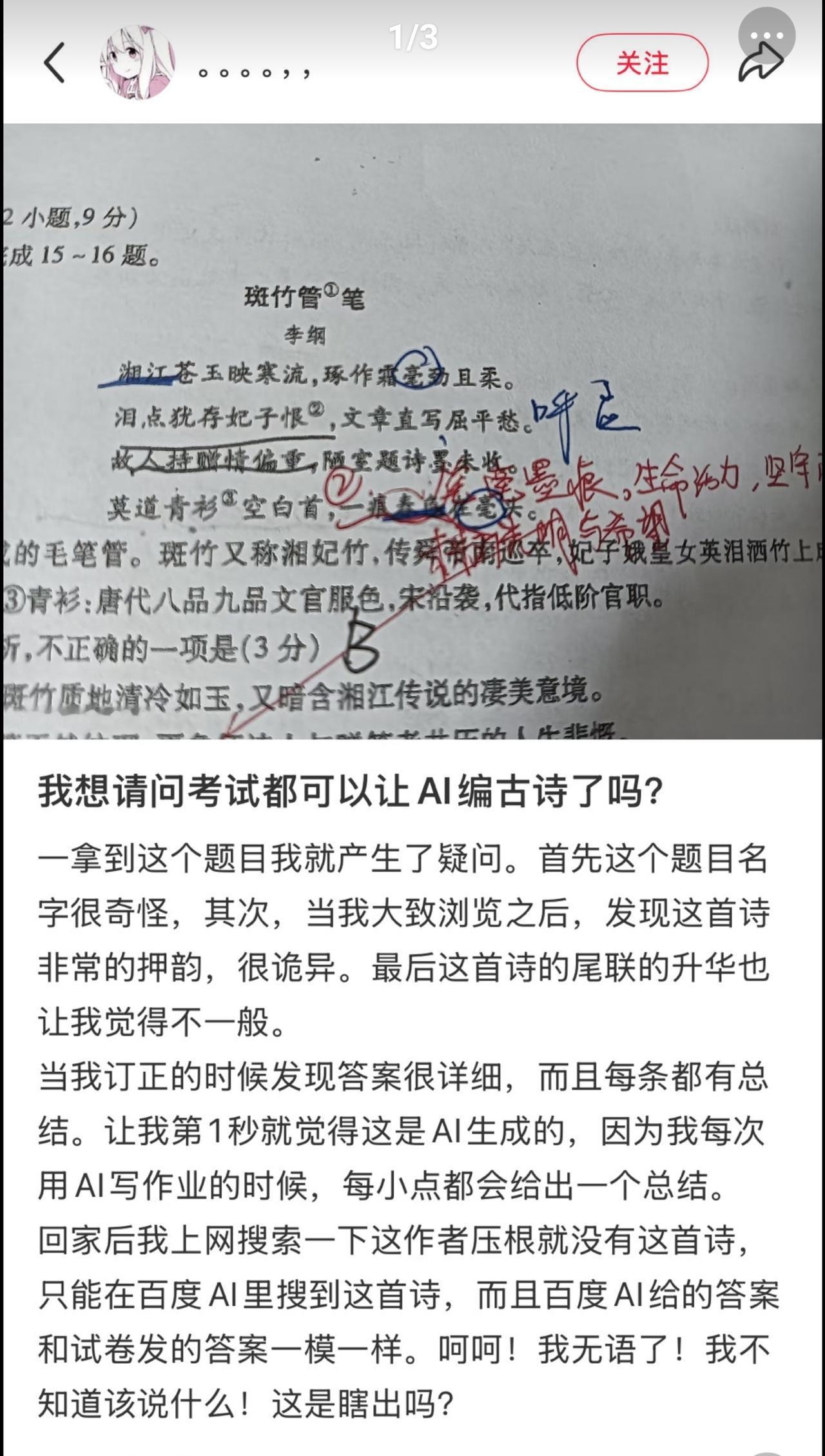 看到网友吐槽现在高中语文试卷都用AI出题了。 怎么说呢,在教育行业正常用AI没问题,但语文试卷上,用AI编古诗,然后让孩子们去理解和“体会”AI的感情,这不离谱吗? AI有思想吗,有意境吗,有内涵吗? 所有的一切都应该是人类赋予的,但现在让人类去“理解”电脑,这太讽刺了!