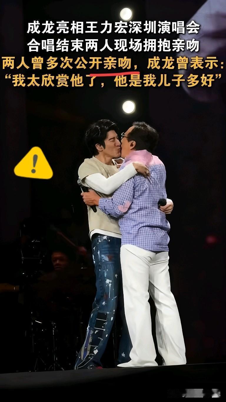 任谁都没料到, 王力宏深圳演唱会上, 71岁成龙一露面就怎么做,直接把场子唱“破防”了!两代男神并肩合唱《朋友》,他拍着力宏肩膀说“你要是我儿子多好”的模样,比歌词还戳人。 没人会觉得他们的拥抱亲吻刻意,毕竟大哥早说过“他是我儿子多好”,这种偏爱藏不住的。当年拍《大兵小将》同住三月,他见力宏一有空就写歌的拼劲,才认定这是“完美”的模样。王力宏眼眶泛红的瞬间,哪是简单的友情,分明是亦师亦父的真心交付。 娱乐圈的关系总被说虚,但他俩的情谊熬得过时间。你见过最让人动容的跨界友情是哪对?来评论区聊聊~王力宏