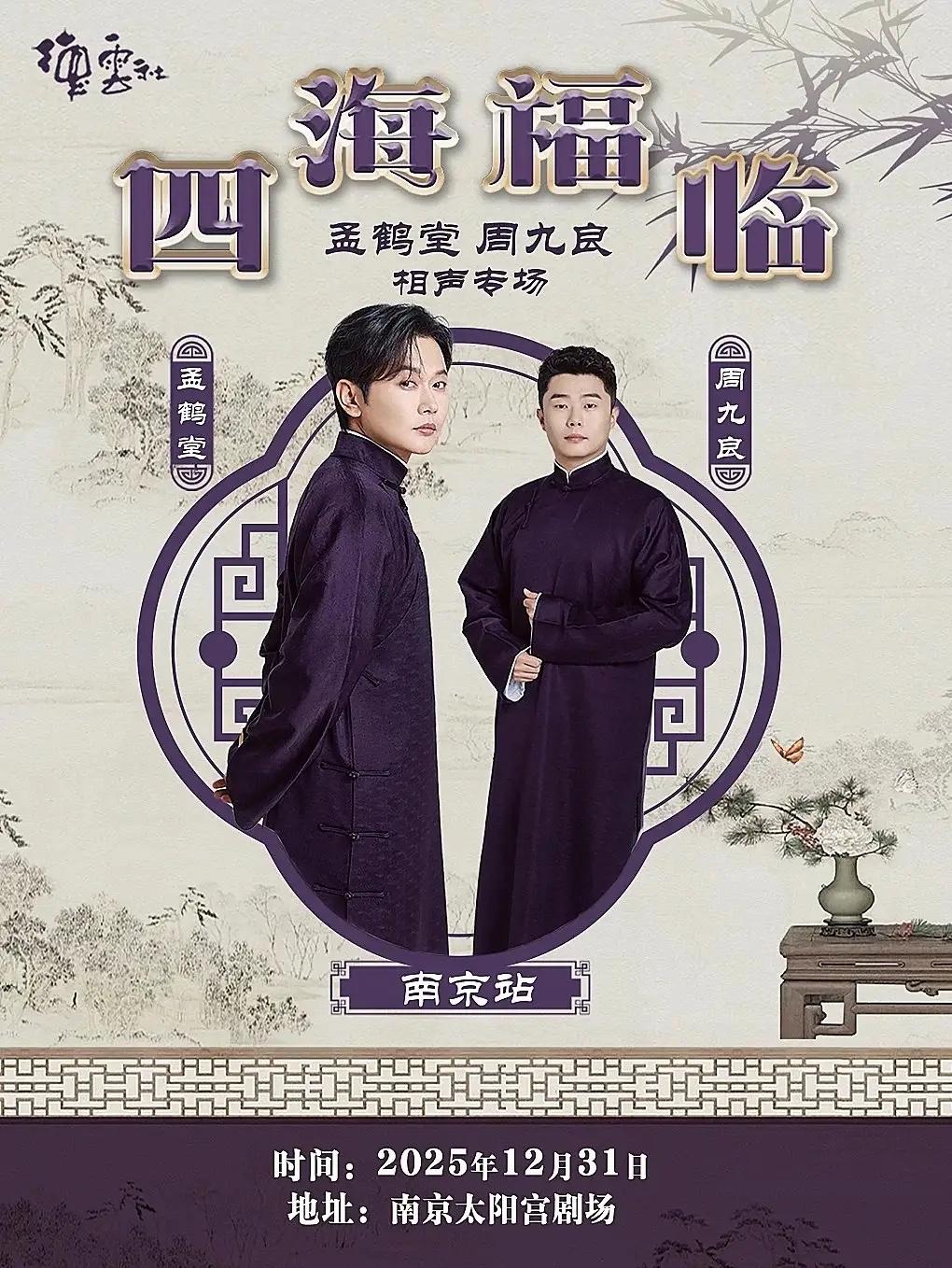 德云社首个跨年专场正式官宣,孟鹤堂周九良跨年专场将在江苏南京举办。演出时间为2025年12月31日,演出场馆是南京太阳宫剧场。孟孟九良跨年已官宣,其他角儿的消息还会远吗?[星星眼] 越临近年底,德云社的角儿们愈发忙碌,各类演出接踵而至。今年跨年又会呈现怎样壮观的场景?又会有哪些小角儿崭露头角?助演嘉宾都有谁?今年还会有纲丝节吗?大封箱哪些人会参加?哎呀!期待实在太多啦,根本看不过来。[星星眼] 德云社票价 周九良 孟苓彤 李川孟鹤堂 孟鹤堂童话镇