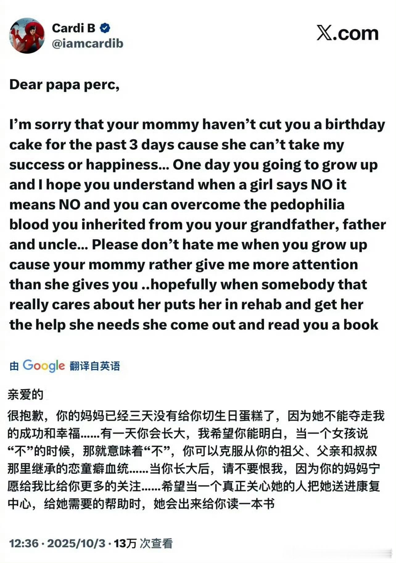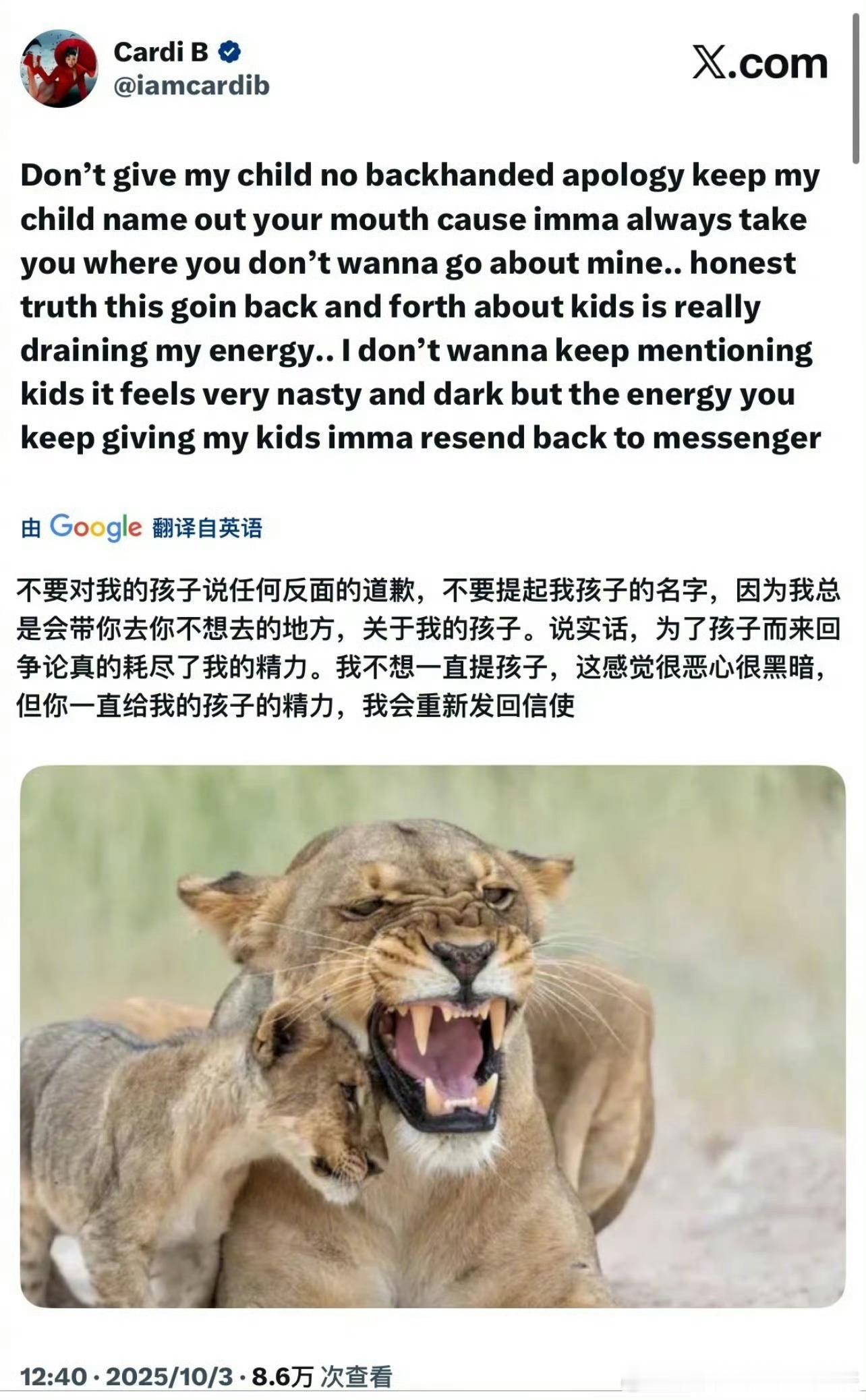 麻辣鸡和CardiB都发文向对方的孩子道歉