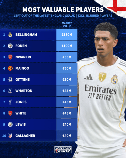 虎扑10月03日讯德转盘点落选新一期英格兰大名单球员身价榜(不含伤病球员),贝林厄姆1.8亿欧居首,福登次席。