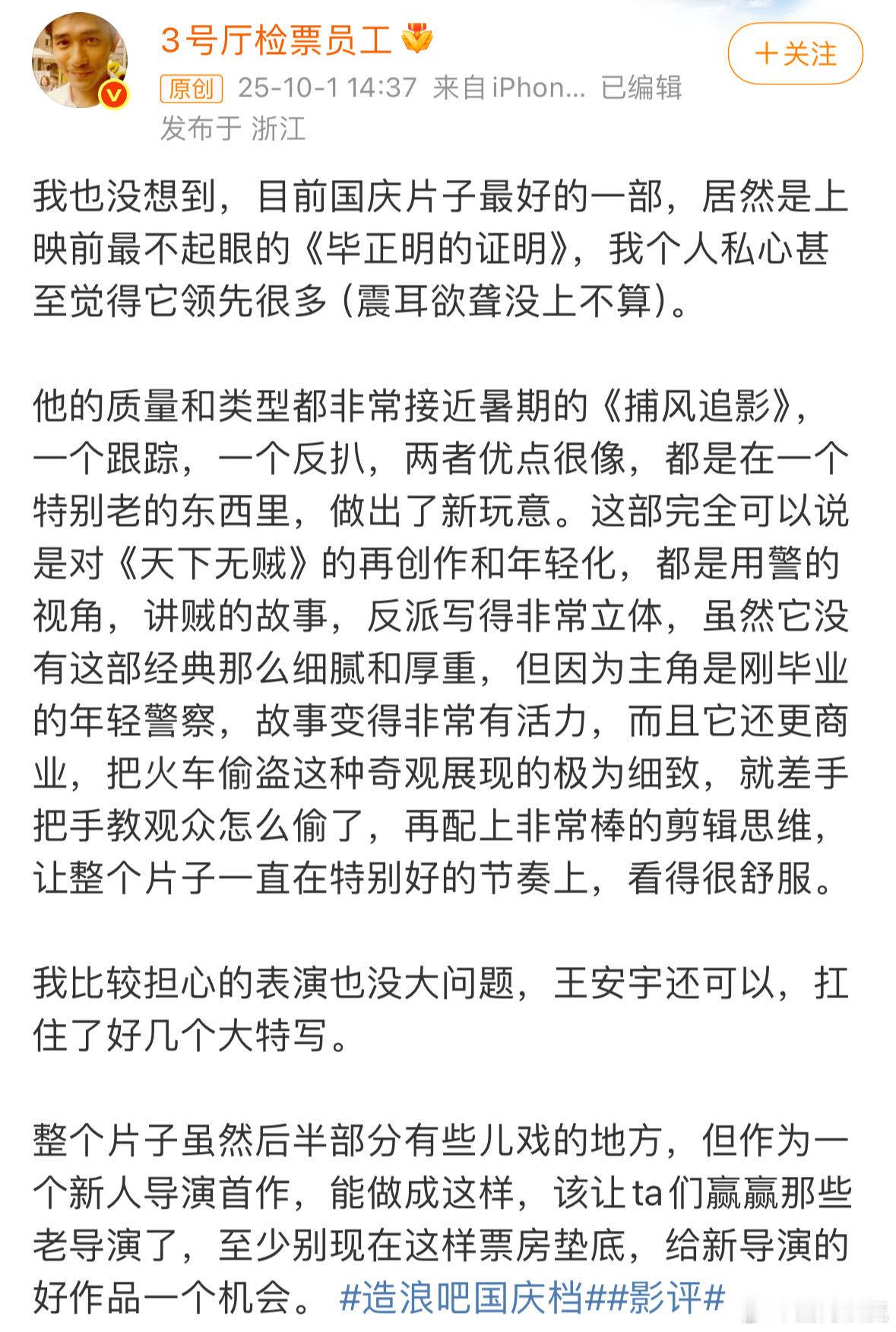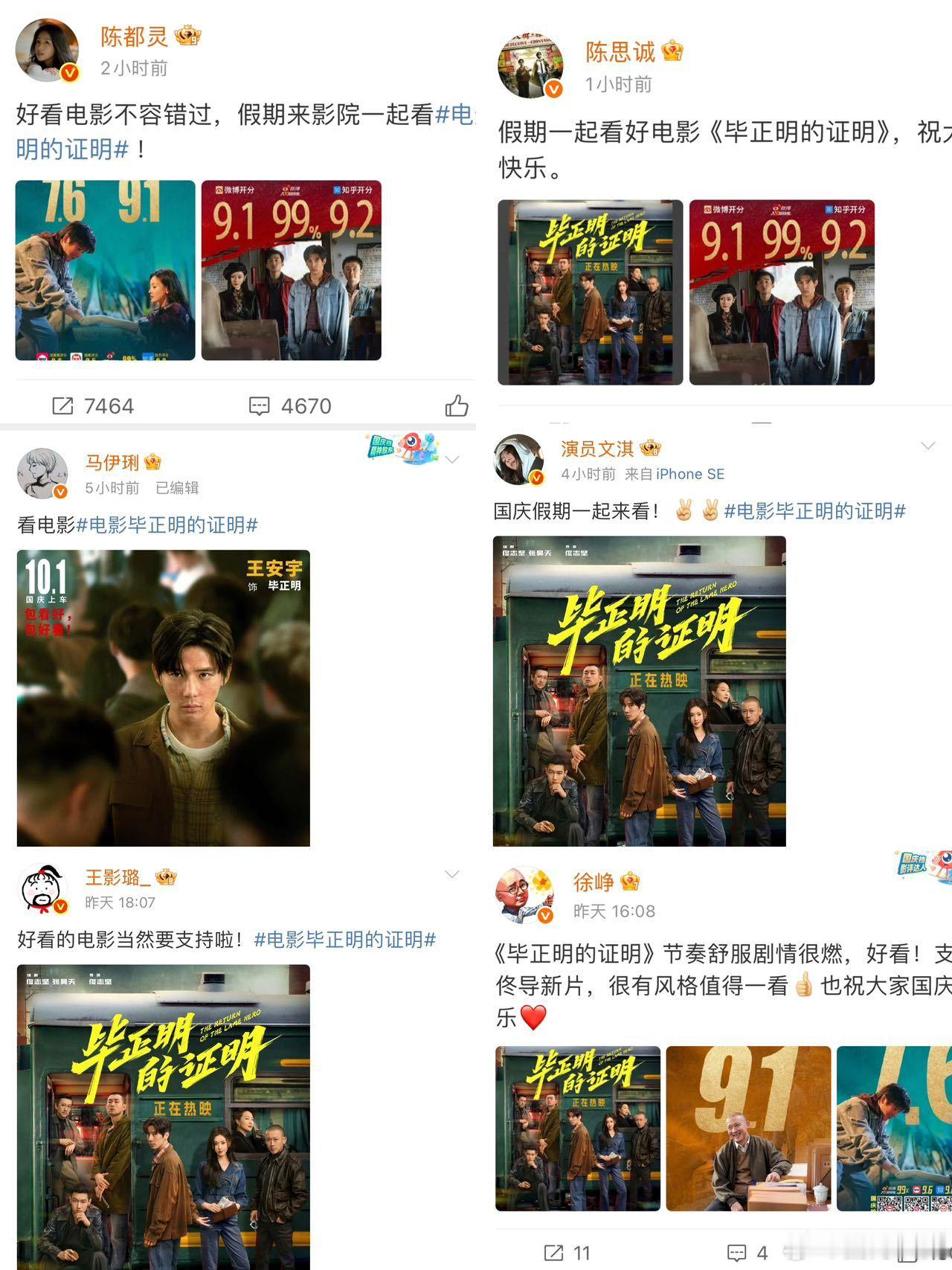 肖战、王源、张靓颖、宋祖儿、梅婷、周雨彤、陈都灵、文淇、屈楚萧、庄达菲、蔡卓妍、黄晓明、宋茜、胡歌、马伊琍、徐峥、陈思诚、董璇…都来给这部电影打call了!好电影真的值得被看见!《毕正明的证明》也是实惨,极限空降靠着过硬的质量拿下国庆档口碑第一的成绩,然后票房成绩却演了一出虐心大戏,和它的实力根本不成正比。很多影迷也反映排片过少,很多都是凌晨场次,很难在合适的时间观影,甚至被退票,这简直是悲上加悲!