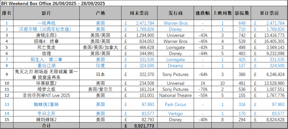 英国周末票房(9.26-9.28):1.PTA《一战再战》开画夺冠!2.《汉密