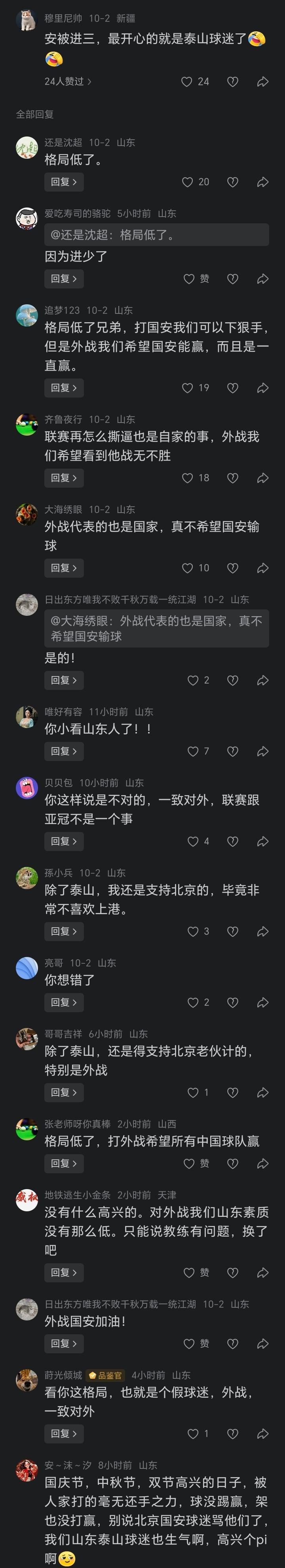 北京国安输球最开心的是山东球迷?评论区一水的山东球迷告诉你答案:格局低了。 北京国安在亚二赛场0-3麦克阿瑟队后,有球迷在评论区说:安被进三,最开心的就是泰山球迷了。此言一出,遭到众多泰山球迷回应,格局低了,外战一致对外,还有的说除了泰山队最支持北京国安队。