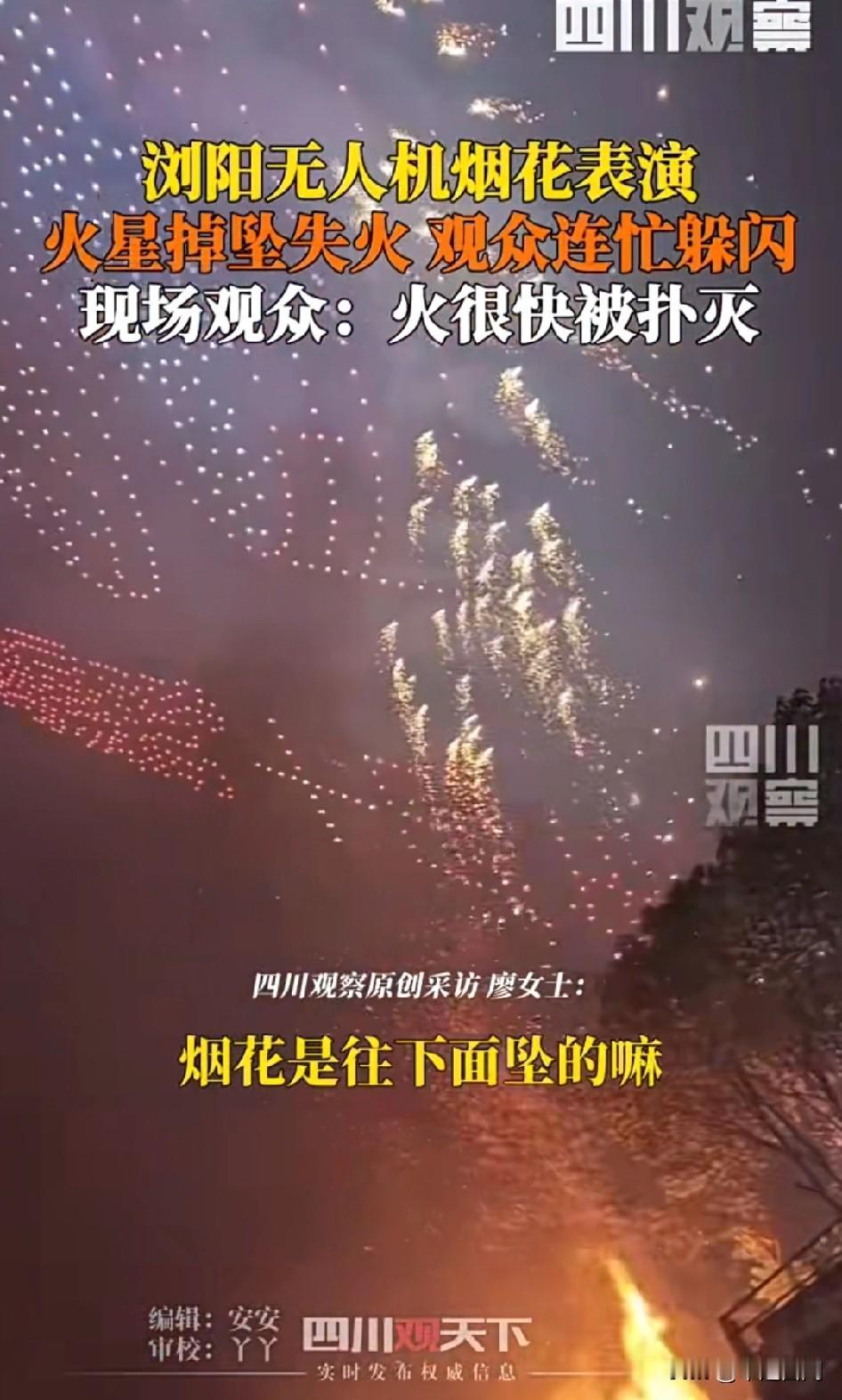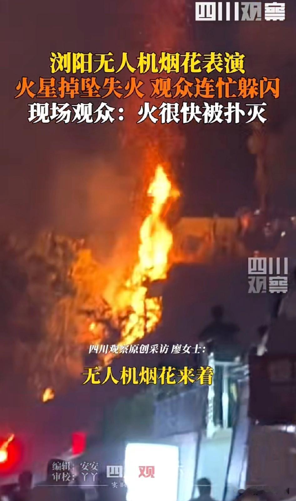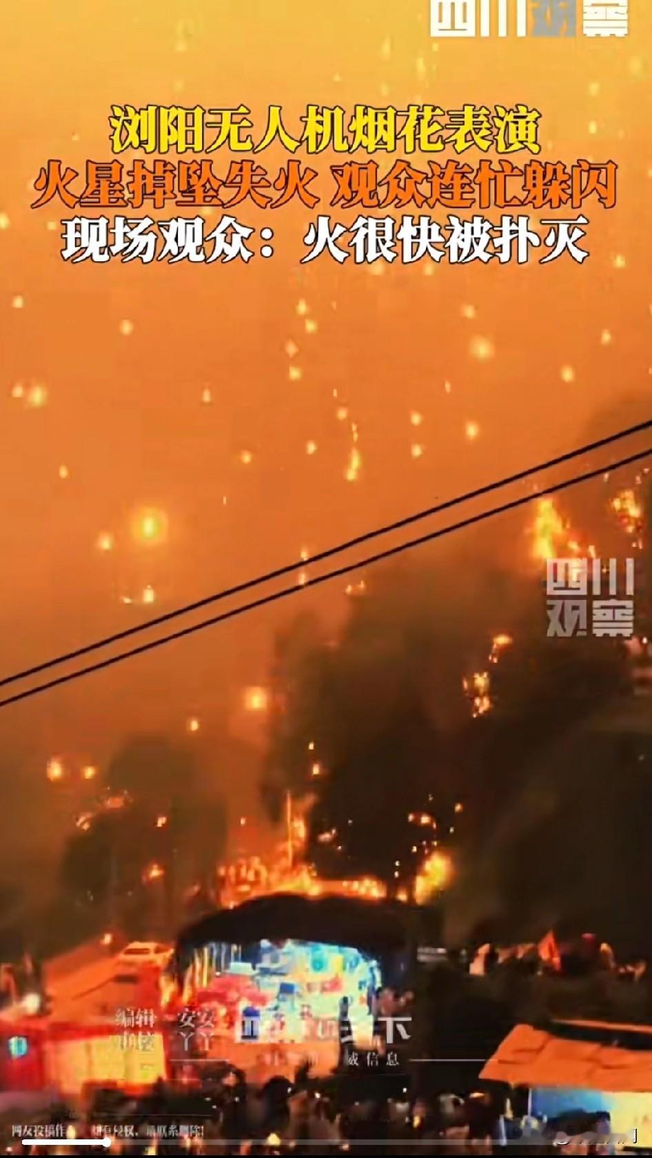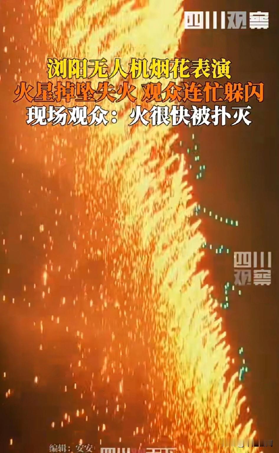 这种烟花表演太危险! 10月2日,湖南浏阳无人机烟花表演现场失火,火星从空中掉坠砸落,观众连忙躲闪。现场观众:火势很快就被扑灭了! 几千几万个无人机万一失控炸机,伤害到人民群众怎么办!谁负责,出事找谁负责!应该禁止一切无人机表演!特别还带着烟火的无人机,就是不可控危险因素!