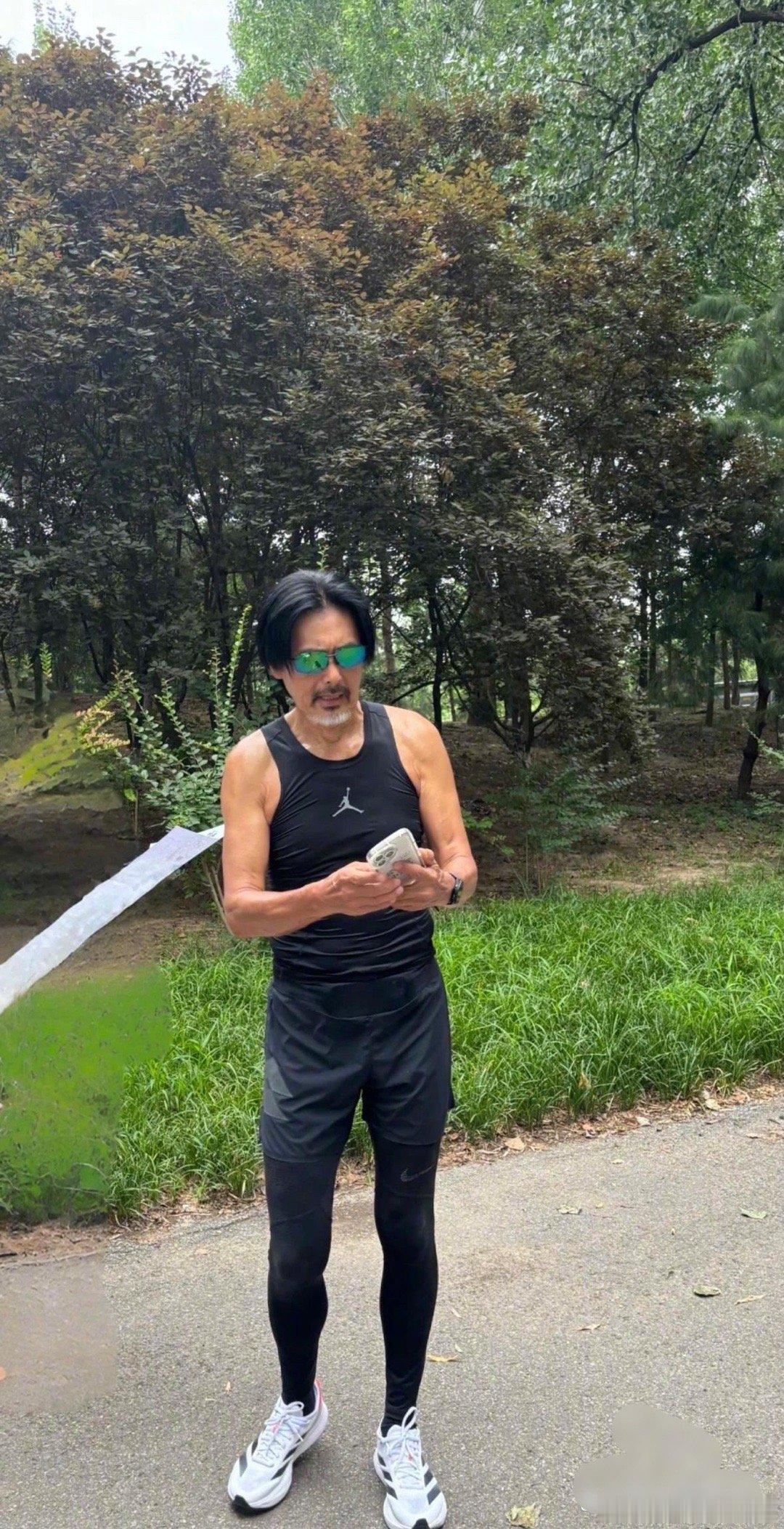 69岁的周润发在北京朝阳公园跑步,身体状态好极了