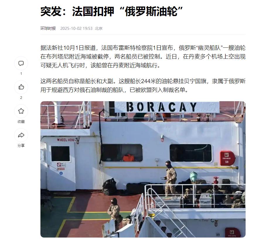 普京将会怎么报复?倘若这次,俄罗斯不敢回击法国,那么,西方各国都要开始抓,俄罗斯影子船队油轮!俄罗斯的600-1000艘油轮,一旦出海,将再无安全可言。 据法新社10月1日报道,法国布雷斯特检察院1日宣布,俄罗斯“幽灵船队”一艘油轮,在布列塔尼附近海域被截停,两名船员已被控制。 不得不说,法国特种部队在北约军事基地,扣了俄罗斯11万吨级的“长滩岛”号油轮,这哪是查什么走私啊,分明是当着全世界的面,薅俄罗斯的虎须! 别以为俄罗斯就这点本事,它手里那600多艘影子油轮,可不是摆着看的,这些船挂着贝宁、利比里亚的旗,没西方保险照样在海上跑,之前就靠着这招把石油卖到全球。法国以为扣一艘就能杀鸡儆猴? 普京直接派苏-35战斗机给油轮护航,就像去年5月拦截爱沙尼亚海军那样,战机在头顶盘旋,雷达锁定着北约军舰,看谁还敢凑上来登船。更绝的是,听说俄罗斯要给船员配重机枪,学当年中国海军索马里护航的路子,真要动起手来,谁吃亏还不一定呢。 当然,光在海上较劲还不够,普京手里最狠的牌从来都是能源。俄罗斯2024年石油出口2.4亿吨,天然气产量6850亿立方米,其中1190亿立方米是通过管道输往欧洲的,现在欧洲刚从能源危机里缓口气,冬天还得靠俄罗斯的天然气供暖。 普京只要把对法国的天然气供应量砍一半,巴黎的居民就得裹着羽绒服过冬,商场里的暖气都得关掉。更狠的是,俄罗斯还能联合伊朗、委内瑞拉搞“石油减产联盟”,把油价炒到150美元一桶,欧洲通胀本来就压不住,这一下直接就得爆表,老百姓的日子更没法过了。 倘若北约想靠人多欺负人?普京早把俄白联盟这张牌打好了。去年12月俄白签的《国家安全保障条约》可不是废纸,白俄罗斯总统卢卡申科早就放话,要在境内部署俄罗斯的“榛树”导弹系统,专门盯着北约东翼。 现在法国带头挑事,普京说不定真把战术核武器运到白俄,到时候导弹射程能覆盖巴黎、柏林,北约那些军事基地全在打击范围内。更要命的是,俄白联合部队可能在波兰边境搞大规模军演,坦克、装甲车密密麻麻排开,北约就得把兵力往东边调,哪还有功夫管地中海的油轮?这一下就把北约的防线扯得稀碎。 另外,俄罗斯的黑客也不是吃素的,2023年就黑过欧盟政府的邮件系统,用零日漏洞把官员的机密文件,偷了个精光,让欧盟颜面扫地。这次法国敢扣油轮,黑客们说不定直接对法国电力系统下手。 再就是,普京还能拉上中东的盟友一起发力,叙利亚有俄罗斯的塔尔图斯海军基地,伊朗有俄罗斯帮着建的无人机生产线。只要普京松绑伊朗的石油出口,让伊朗多卖油赚了钱,胡塞武装就能加大对红海航运的袭击,到时候北约不仅要管地中海的油轮,还得抽调兵力去红海护航,分身乏术。 更别说土耳其本来就跟北约不是一条心,普京要是跟埃尔多安打个招呼,让土耳其封锁博斯普鲁斯海峡,北约军舰连黑海都出不来,还怎么支援法国?这一下就把北约的海上通道堵死了。 经济上俄罗斯也能让法国疼到骨子里,之前麦当劳、宜家这些西方企业想在俄罗斯捞钱,结果被普京直接赶出去,资产全给收了。现在轮到法国企业了,空客在俄罗斯有数十架飞机被扣押,雷诺的汽车工厂早就被国有化,道达尔的油田项目也停了,这些企业在俄罗斯的投资全打了水漂。 舆论战普京也玩得溜,俄罗斯媒体已经开始深挖法国的黑历史,把法国在非洲掠夺资源、搞殖民统治的事儿全扒出来,让法国在国际上丢尽脸面。还帮着“黄背心”运动发声,给抗议者提供资金和物资,让巴黎街头再次乱起来。马克龙不是想转移矛盾吗?普京直接把矛盾给你送回家里,看你怎么收场。甚至还能放出法国特种部队扣油轮时的违规视频,让全世界都知道北约才是“海上恶霸”。 最后还有核威慑这张终极底牌,俄罗斯战略火箭军已经进入高度戒备状态,“萨尔马特”洲际导弹随时能发射,普京在克里姆林宫召见国防部长绍伊古时就明说了,“不排除使用一切手段保卫国家利益”。要是北约真敢对俄罗斯油轮动武,普京说不定就在白俄罗斯举行核演习,让战术核武器出现在北约家门口,到时候北约再横,也得掂量掂量会不会引发核战争——你是想抓几艘油轮,还是想让整个欧洲陪葬? 现在好了,马克龙本来想靠扣油轮刷存在感,结果把马蜂窝捅炸了。普京的报复招招都往北约的软肋上戳。说实在的,法国这波操作纯属脑子进水,以为有北约撑腰就能欺负俄罗斯,忘了普京从来不吃这一套。大家觉得普京接下来会不会真的动北极或者核威慑这张牌?要是北约继续硬刚,最后会不会闹到不可收拾的地步?评论区都来聊聊呗! 参考资料:环球时报