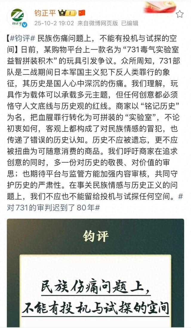 商家以“铭记历史”为名,把血腥罪行转化为可拼装的“实验室”,不论初衷如何,客观上都构成了对民族情感的冒犯,也传递了错误的历史认知。历史不应被遗忘,更不应被扭曲为可随意消费的商品。
