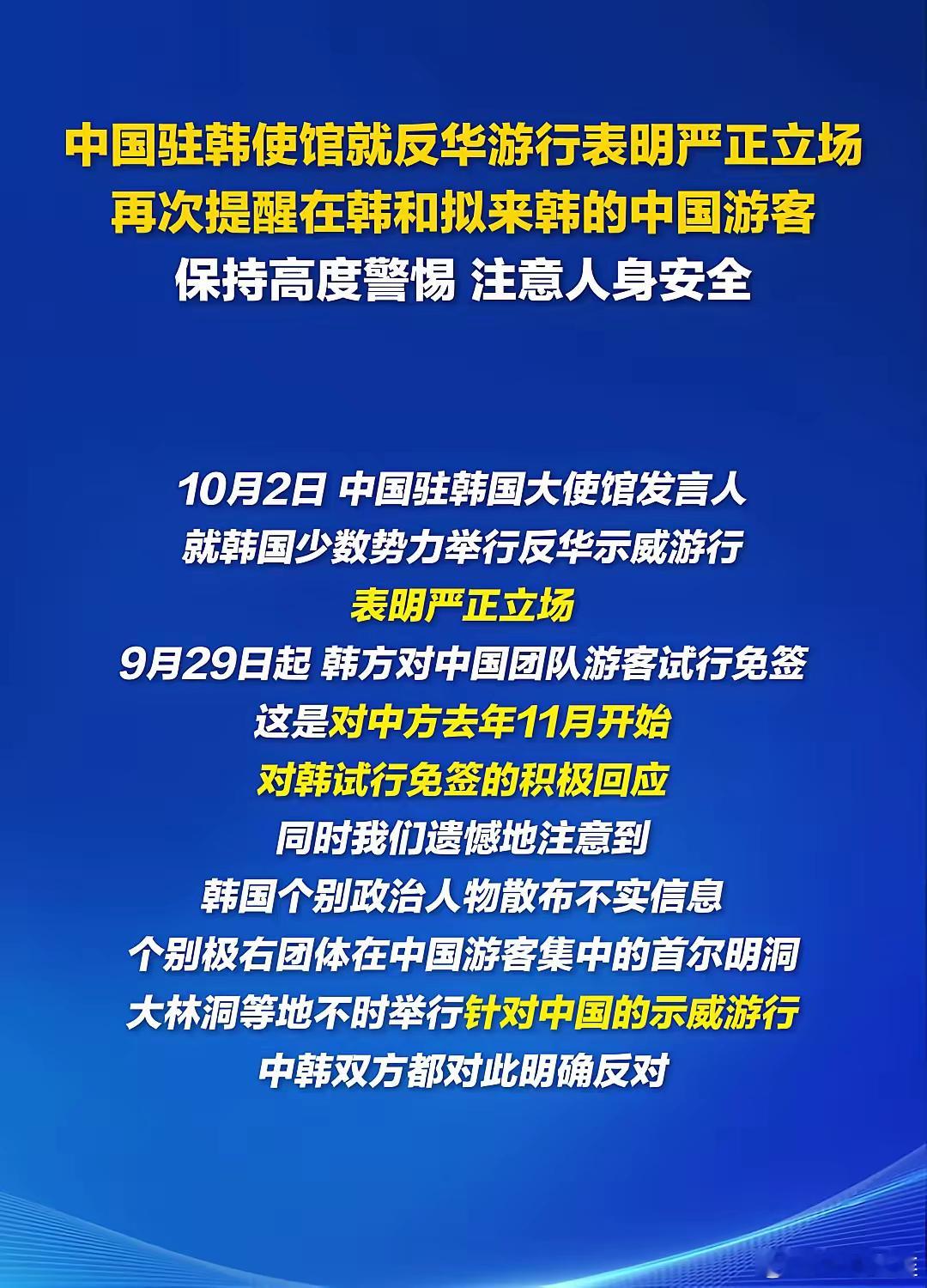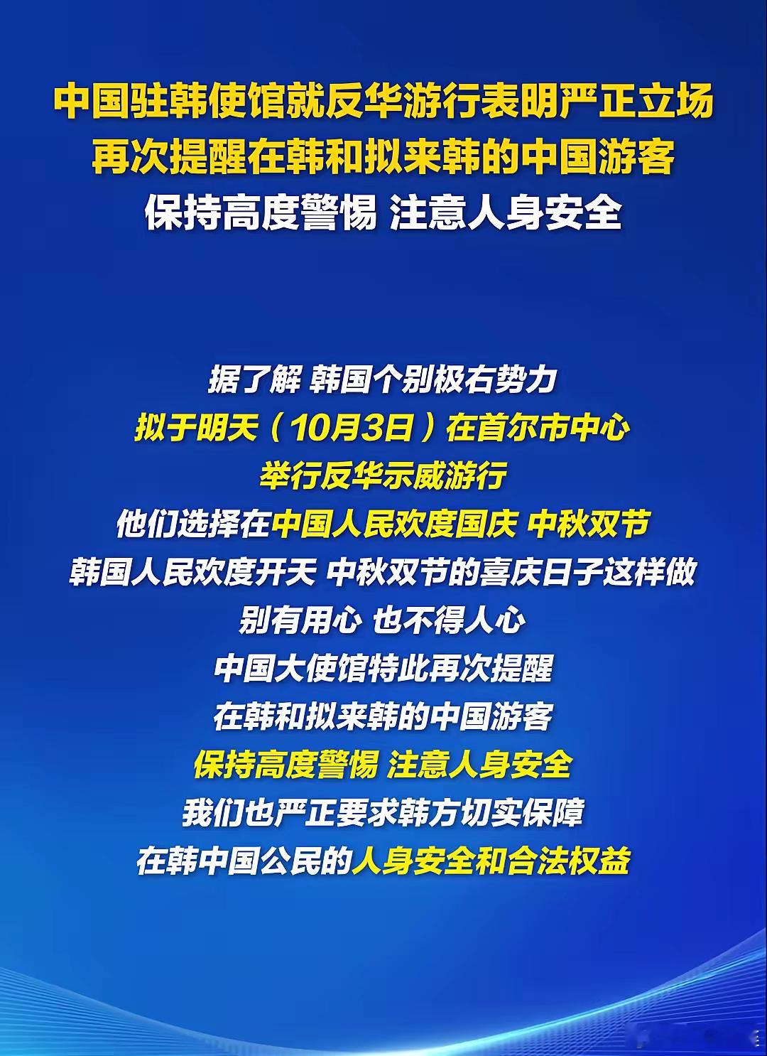 ​韩国极右翼势力要在韩国首尔市中心举行反华游行,中国驻韩大使馆紧急提醒在韩国的中国游客,保持高度警惕,注意人身安全。