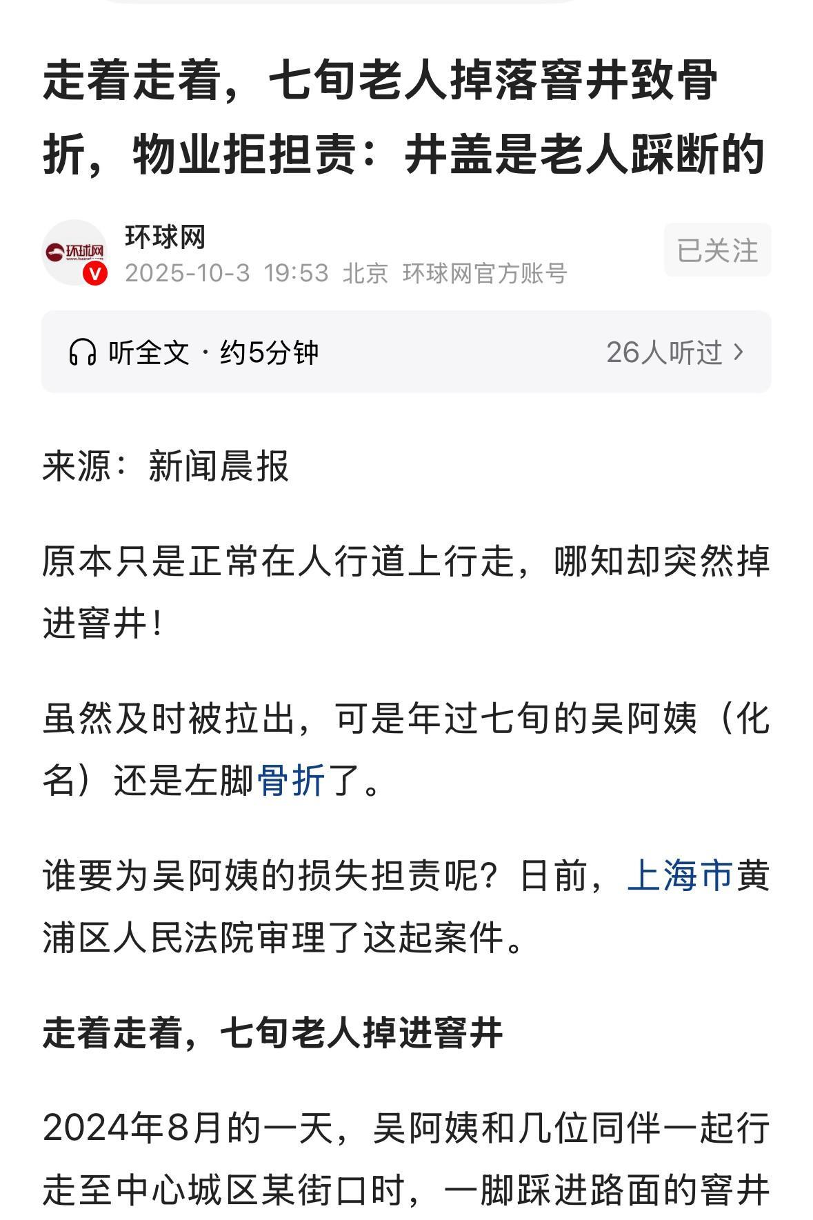 上海,70岁大妈在走路时,一只脚踩进没有井盖的窨井里,导致左脚骨折,跟窨井的管理