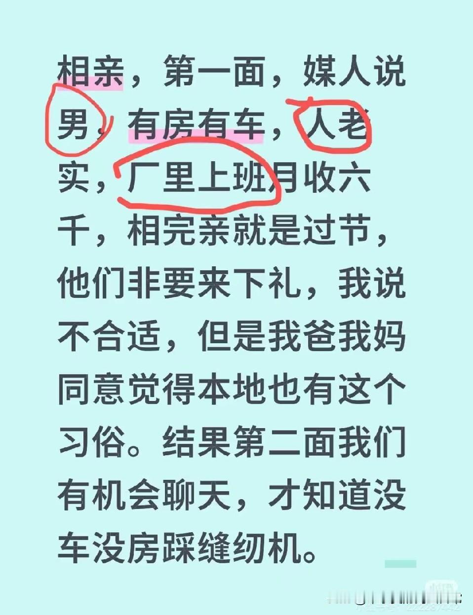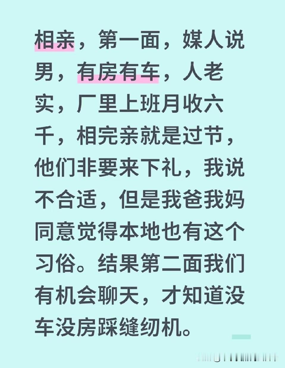 媒人嘴里的有房有车男,竟是踩缝纫机的? 国庆节相亲踩过的坑能有多离谱?我这朋友第一面就被媒人吹上天:男方有房有车,人老实还在厂里月入六千!结果过节对方非要来下礼,父母觉得是本地习俗就应下了。 等到第二面聊天才发现,啥有房有车全是鬼话!这男的不仅没车没房,还在踩缝纫机讨生活! 这媒人怕不是拿了“离谱剧本”在演戏?现在相亲市场的水分都这么大了吗?到底是媒人太能编,还是男方太会装?你们说,这相亲局还有几句真话能信?