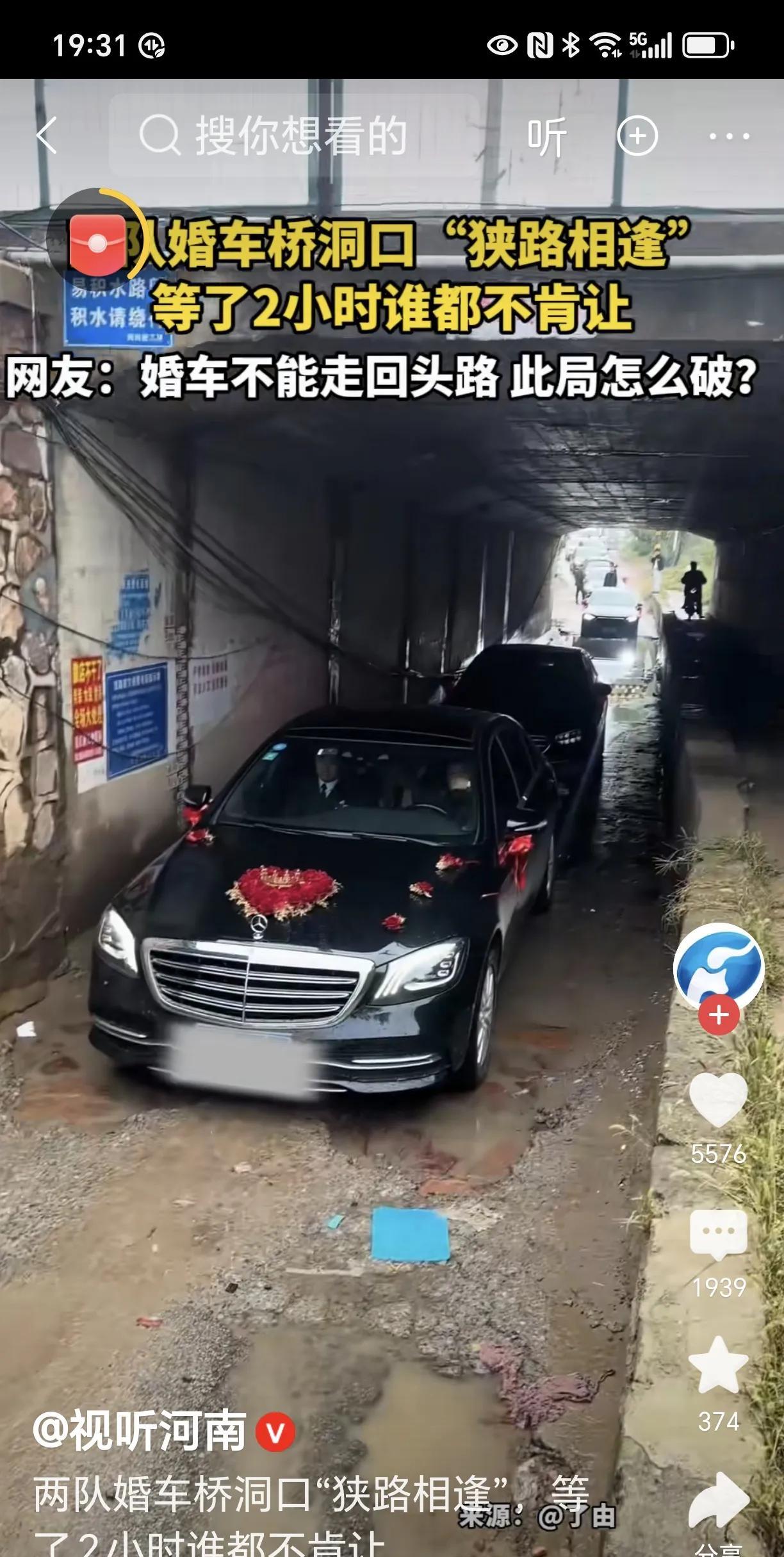 10月1日扎堆结婚,这不,两个结婚车队在乡下公路上迎头碰上,陷入僵局。路本就狭窄,旁边还有个涵洞,两车根本错不开。 这种局面下该如何处置,得靠双方协商解决。民间有句俗语,接亲车辆不能走回头路。如此一来,是依照老理解决问题,还是继续僵持下去呢?