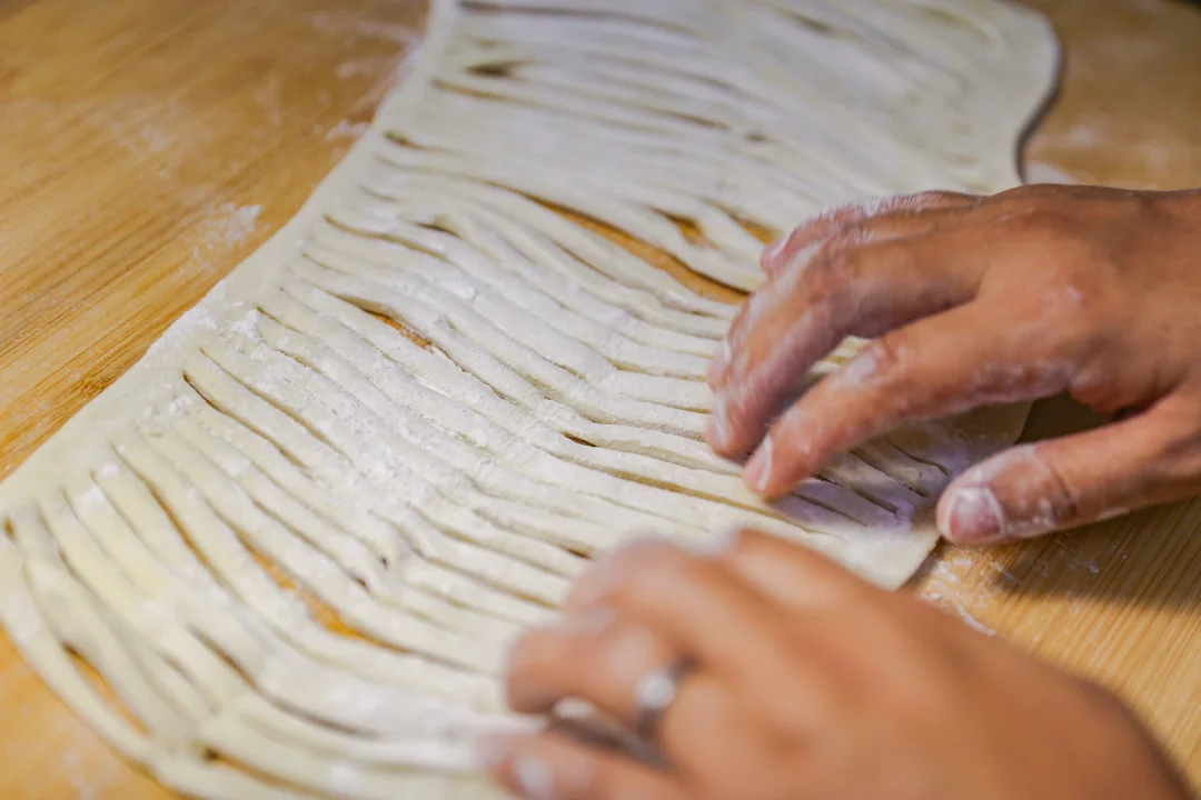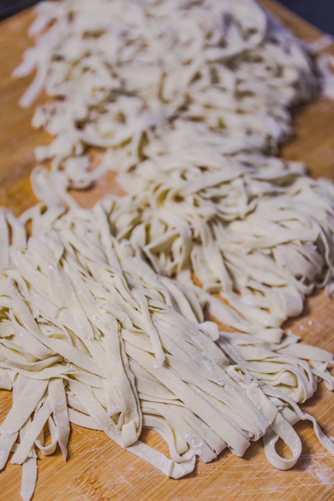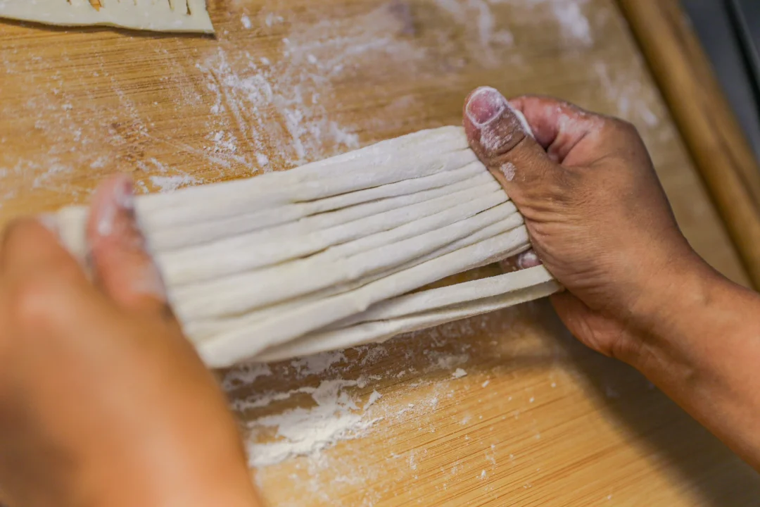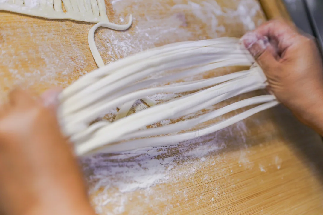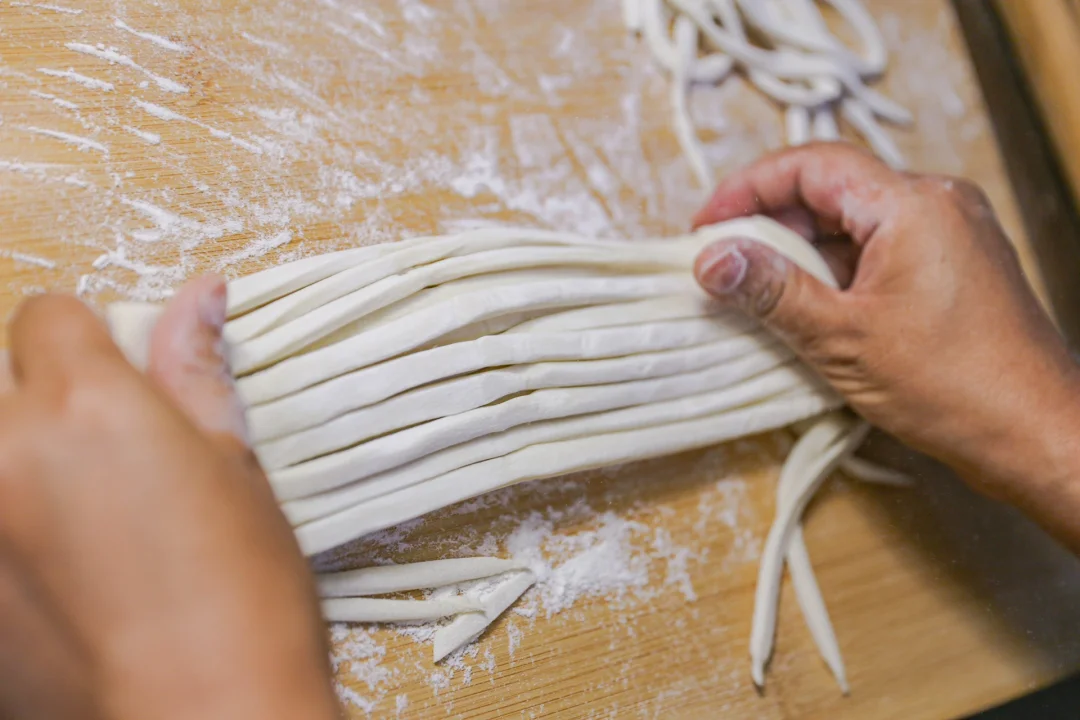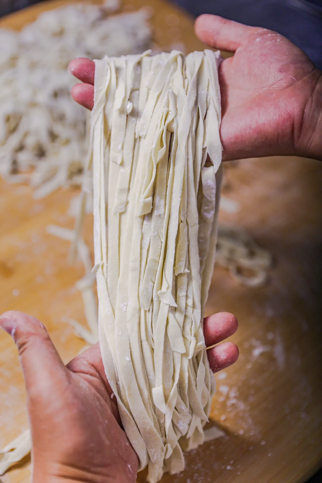 7.用手轻轻捏住两头,用力均匀往两边拉即可,边拉边将面板上的补面往面条上加,以防粘连。