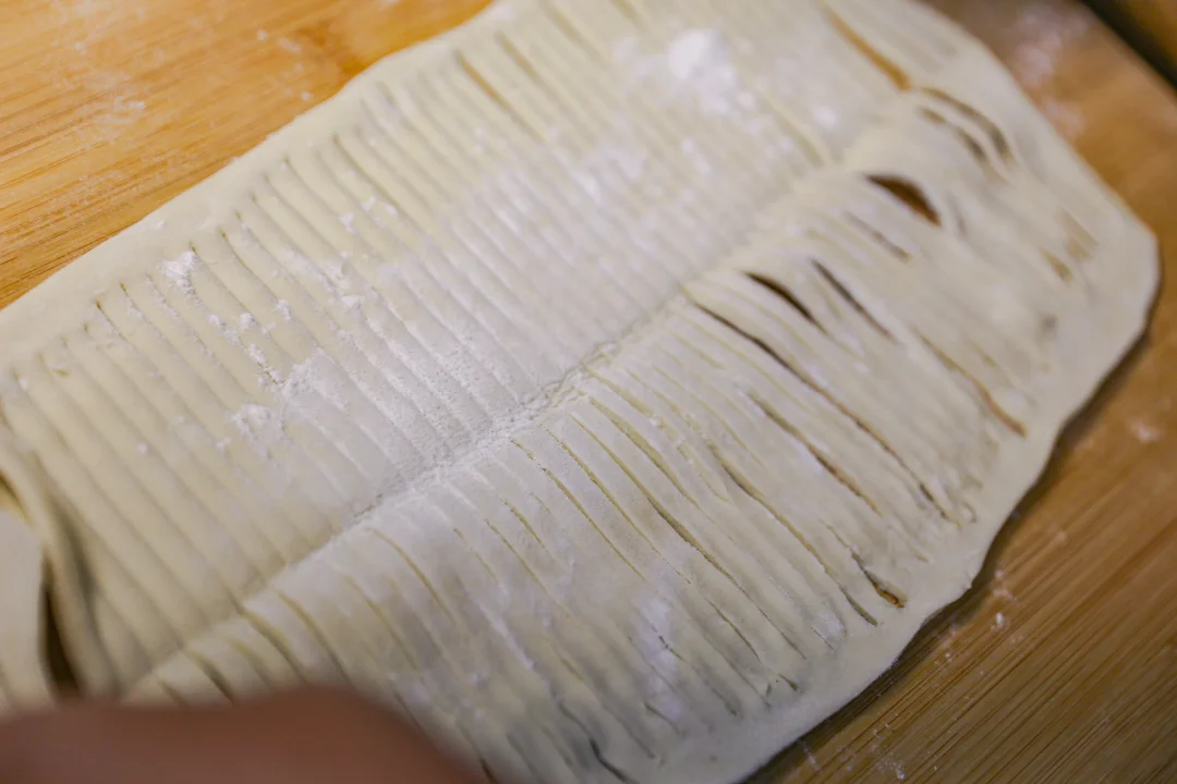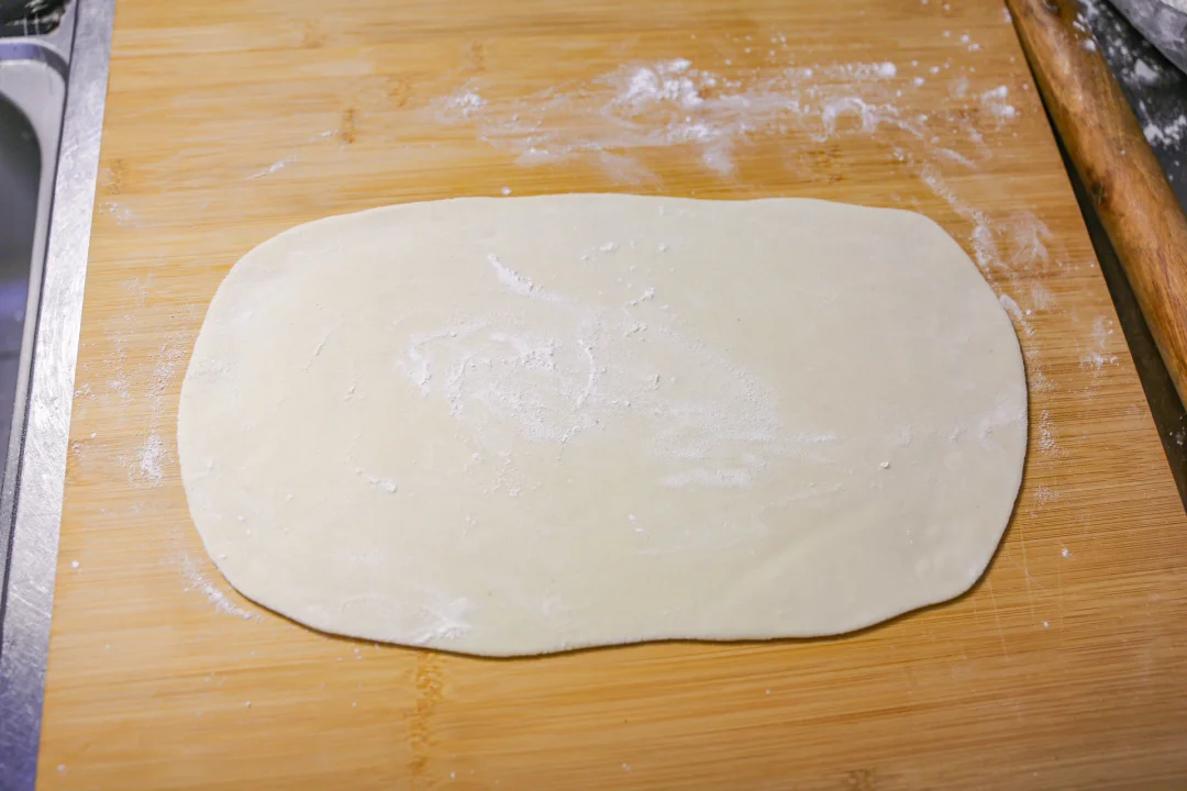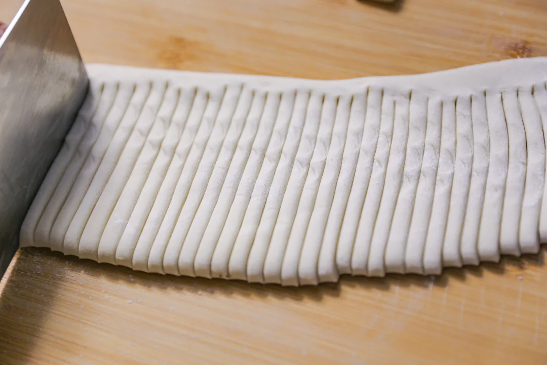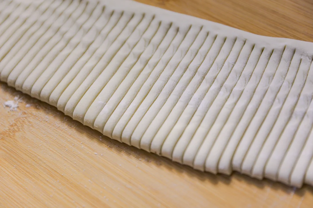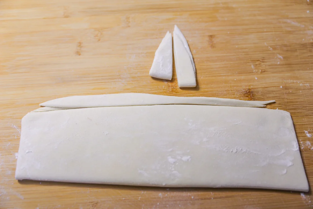 6.切成长条之后,让长方形面片摊开放在面板上。