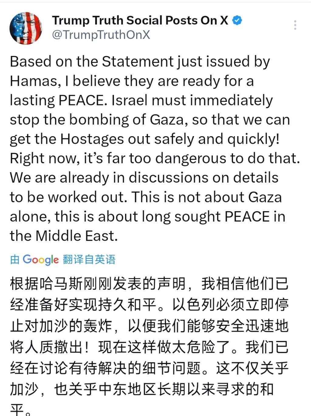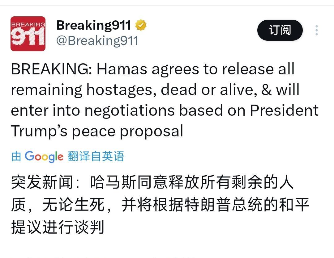 突发新闻:美国总统特朗普今天(北京时间10月4日)发文写道:“根据哈马斯刚刚发表