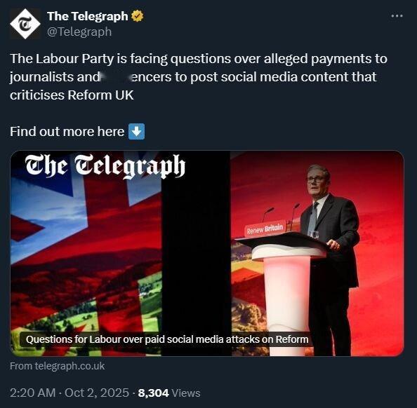 《每日电讯报》 :工党正面临关于向记者和影响者支付款项以发布批评改革英国的社交媒体内容的问题。