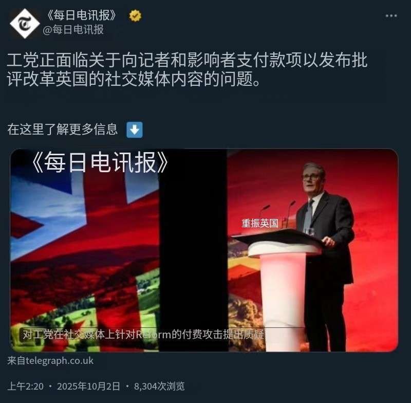 《每日电讯报》:工党正面临关于向记者和影响者支付款项以发布批评改革英国的社交媒