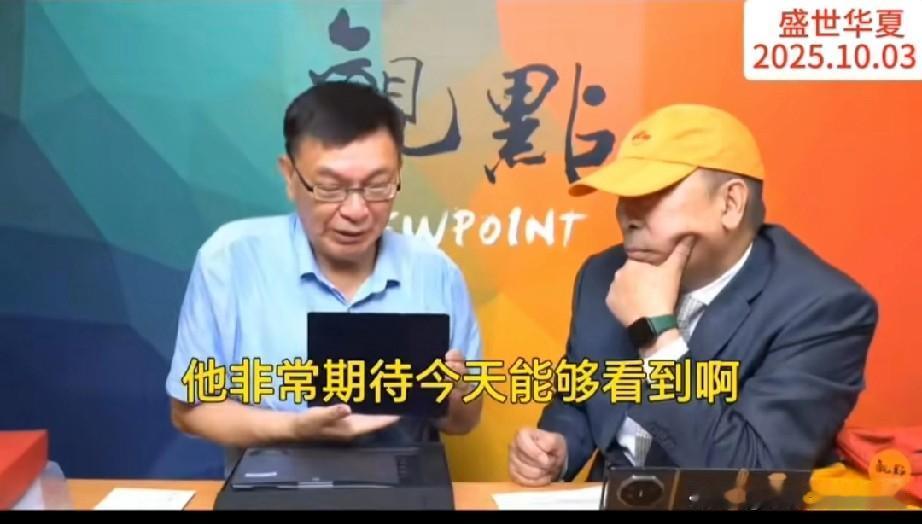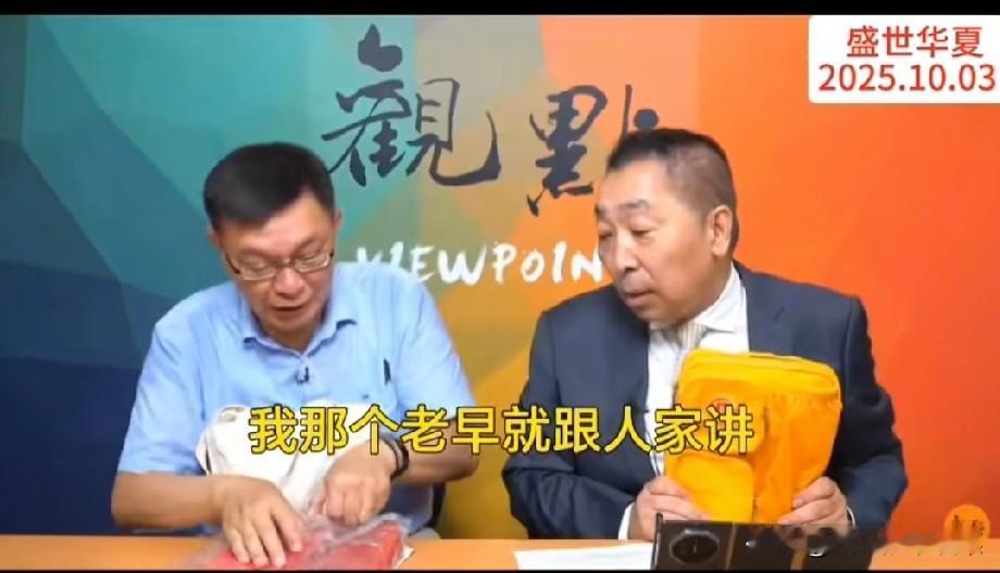 苑举正又双叒上唐湘龙节目“炫”了!这次直接带了“连吃带拿三件套”,也太实在了! 刚从大陆参加完国庆宴席回台湾,他一上节目就掏宝贝:先亮九三阅兵纪念包,再晒宴席邀请函,最后掏出最新款华为三折手机,给唐湘龙看得明明白白。 谁能想到,一个普通台湾哲学教授,会因为一腔爱国情火出圈?这可不是运气好——他在大陆敢说“来了就不怕,怕了就不来”,这份底气绝了;抱着过世父亲的抗战照片看阅兵,眼泪里全是家国情怀,谁看了不感动? 他太懂台湾一代人的牵挂,更是敢站出来的“硬骨头”。一句“我就是拥护统一,我是‘红统’”,不仅听得人热血沸腾,更是给“台独”狠狠一拳! 苑教授这胆识、这直率,是真让人佩服!祖国永远是你最硬的后盾,继续为统一加油,我们都挺你!