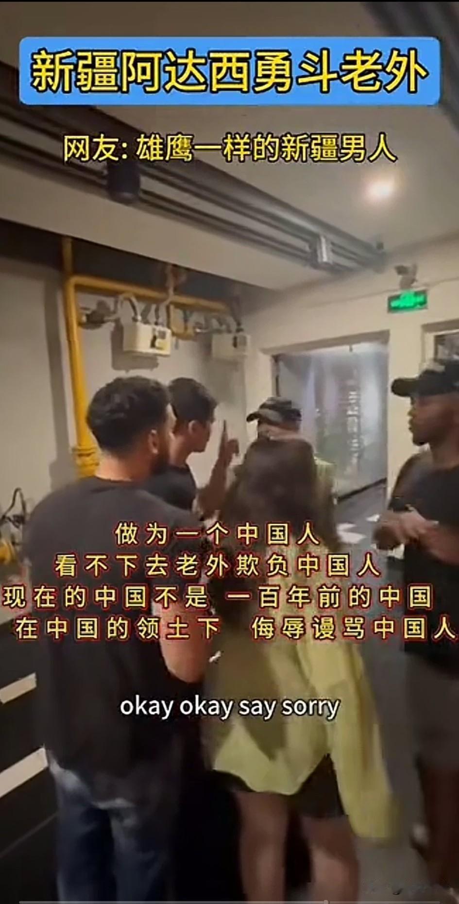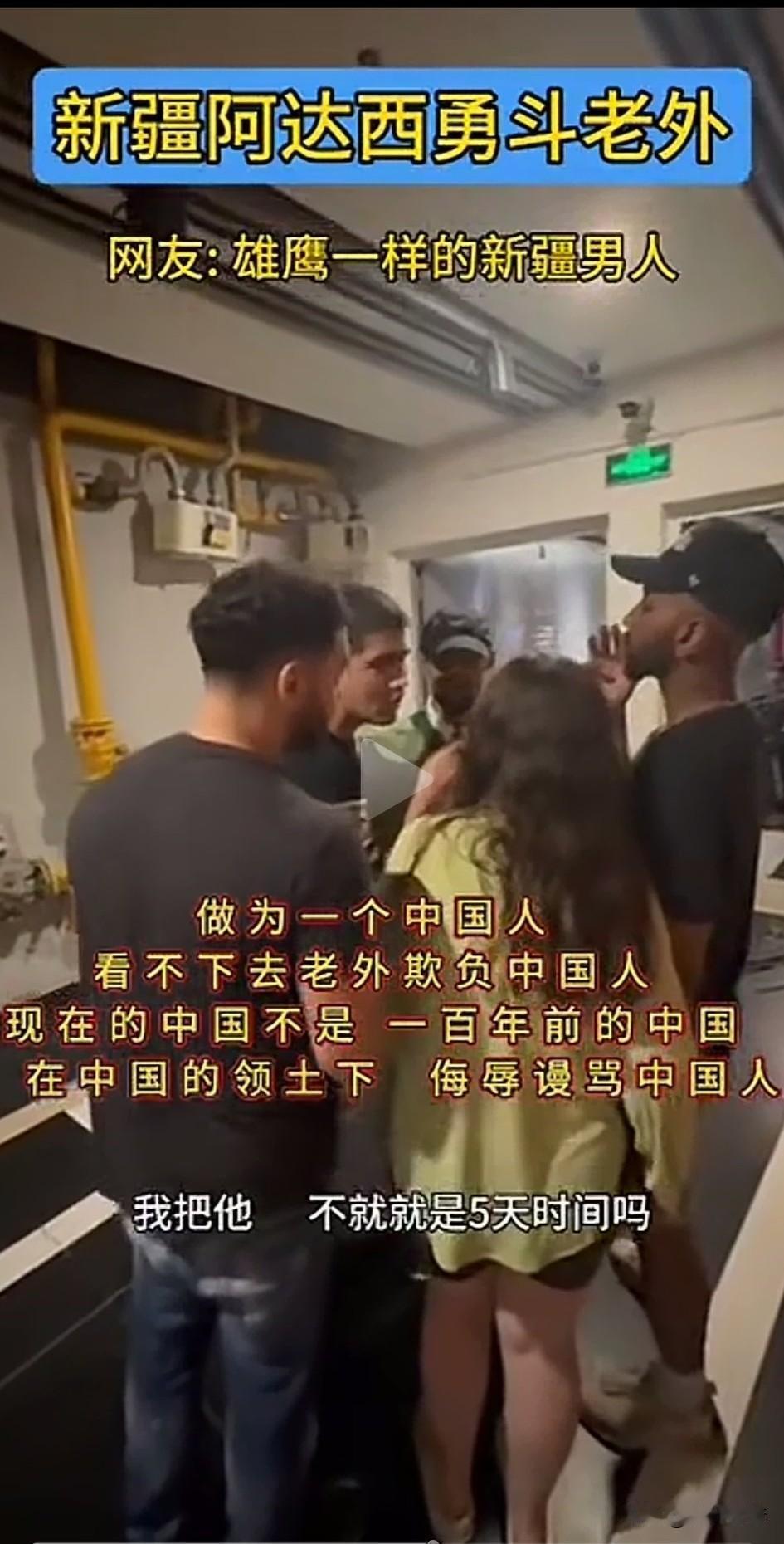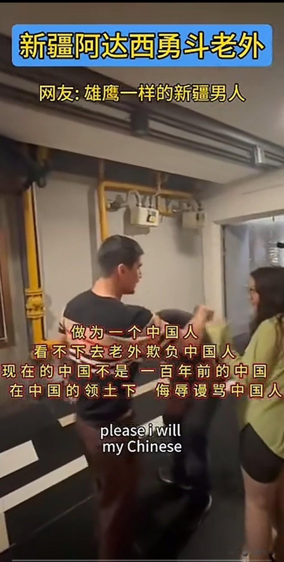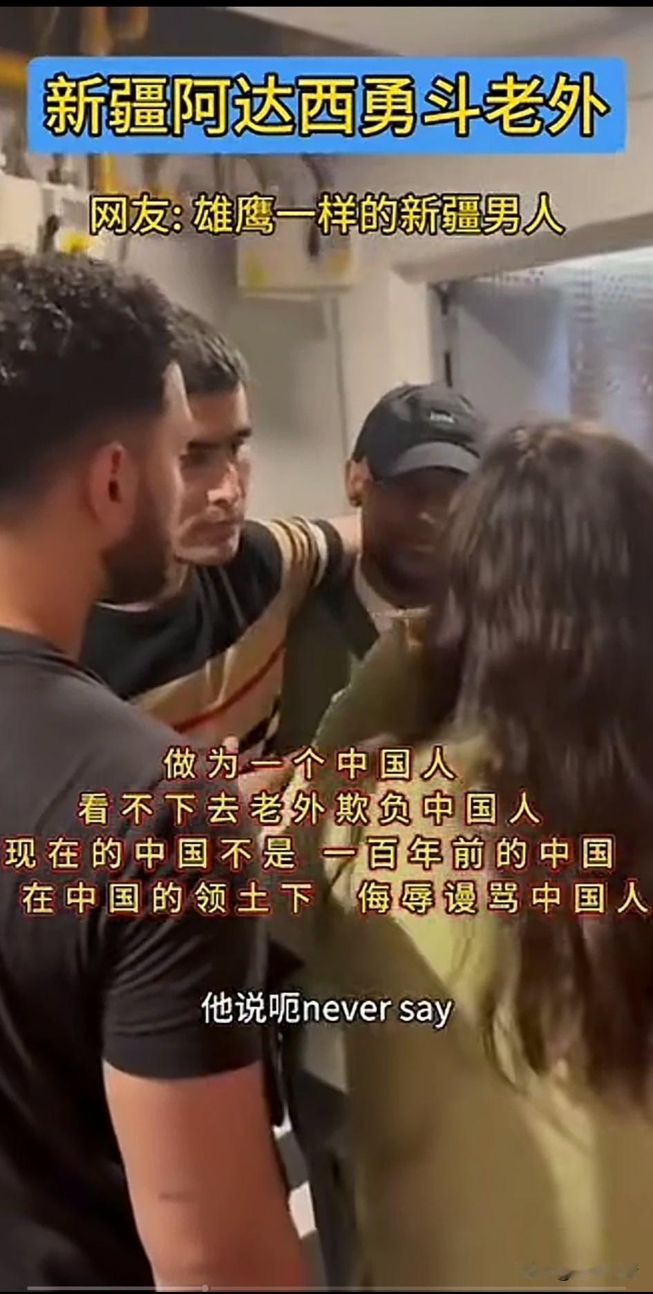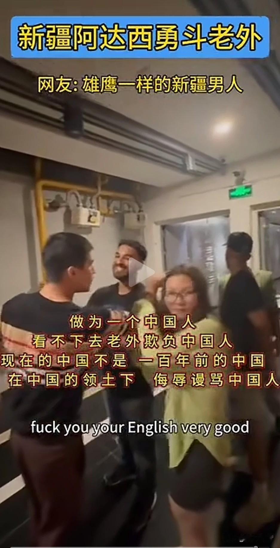 新疆阿达西勇斗老外, 全网沸腾了, 新疆小伙看不下去老外对中国人言语不敬,上去搂着骂人的老外脖子, 让他们的女伴用英语告诉他们, 在中国不允许他给任何人说法克油这个词,女伴惊慌失措, 连忙用英文给老外翻译naver say…… 被搂的老外此时自己被气场强大的新疆小伙镇住了,连忙说sory, 随后新疆小伙用手一把将骂人的老外推了出了,说我把他办了, 不就是5天时间吗? 老外的朋友看新疆小伙子不好惹, 连忙鞠躬赔笑道歉, 被推走的老外吓得呆愣在原地, 中国玩伴看到有人在录像, 也迅速把脸扭了过去, 可能是嫌丢人吧! 现在的中国不是一百年前的中国了, 在中国的领土上,还敢辱骂中国人, 老外的胆子是越来越大了, 不要以为所有的中国人都惯着你, 照样有人解开封印收拾你们, 又不是不知道你们是纸老虎, 新疆阿达西维护国人尊严好样的, 大家对于老外在中国领土上辱骂国人怎么看? 你身边素质低的人多吗 老外的那些事 老外 新疆外国人