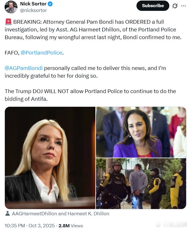 司法部长帕姆·邦迪已经下令由助理司法部长哈米特·迪伦牵头,对波特兰警局展开全面调查,此举源于我昨晚遭到的非法逮捕——邦迪亲口向我确认了这一消息。