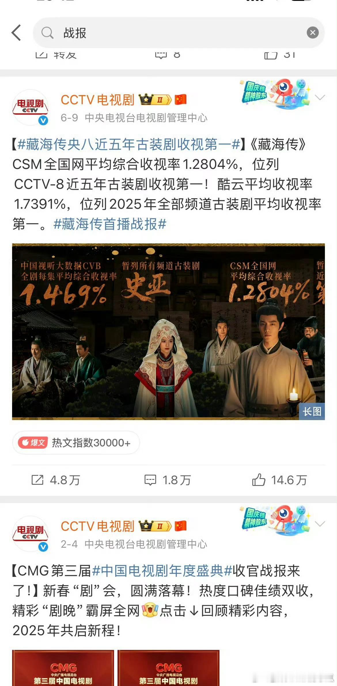 而CCTV8近3年发布的电视剧收视率战报只有《梦中的那片海》和《藏海传》 !