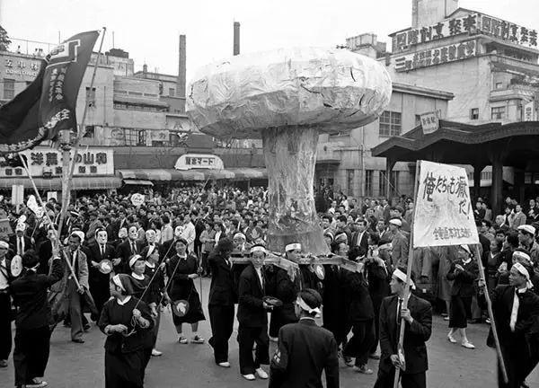 1957年5月1日的东京街头,一场抗议英国计划在圣诞岛测试氢弹的游行正展开。画面中央,一座巨大的氢弹蘑菇云复制品被众人合力抬起。 游行队伍里,人们多穿深黑、藏青色的日常服装,有人紧紧托住蘑菇云模型的支架,有人挥舞着旗帜,还有人高举白底黑字的标语牌——“俺たちも滅びるぞ”(“我们也会灭亡的”),将对核灾难的恐惧与愤怒直白倾泻。