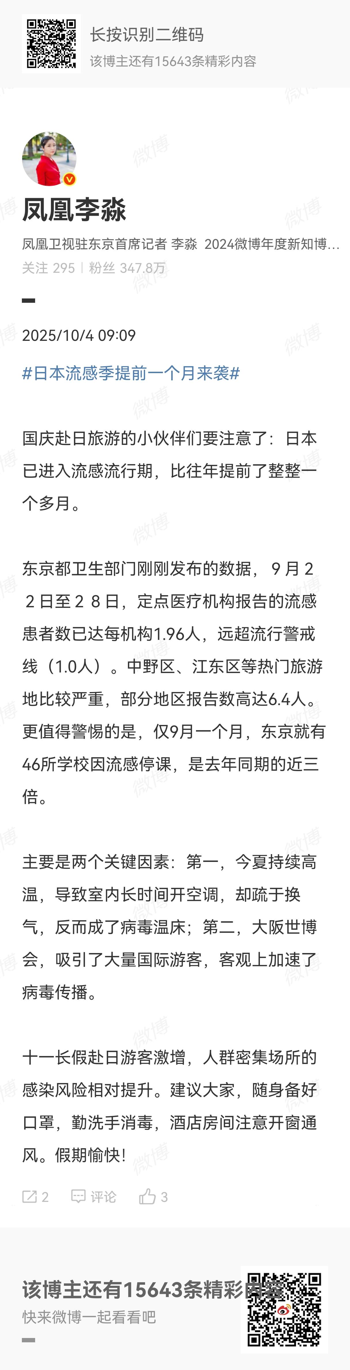 紧急提醒:日本流感已经提前一个月到来,东京在9月份已经有46所学校停课。而恰巧今年国庆黄金时间长,加上大阪世博会等因素叠加,这个黄金周到日本旅游的国人特别多,特别是到大阪旅游的人很多。有报道称,大阪因举办世博会,在国庆期间成为了黄金周最挤的城市。有在大阪旅游的朋友分享,地铁站水泄不通,到处都是讲中文,他们一度以为在国内。请各位切记,保护好自己,提前预防流感!