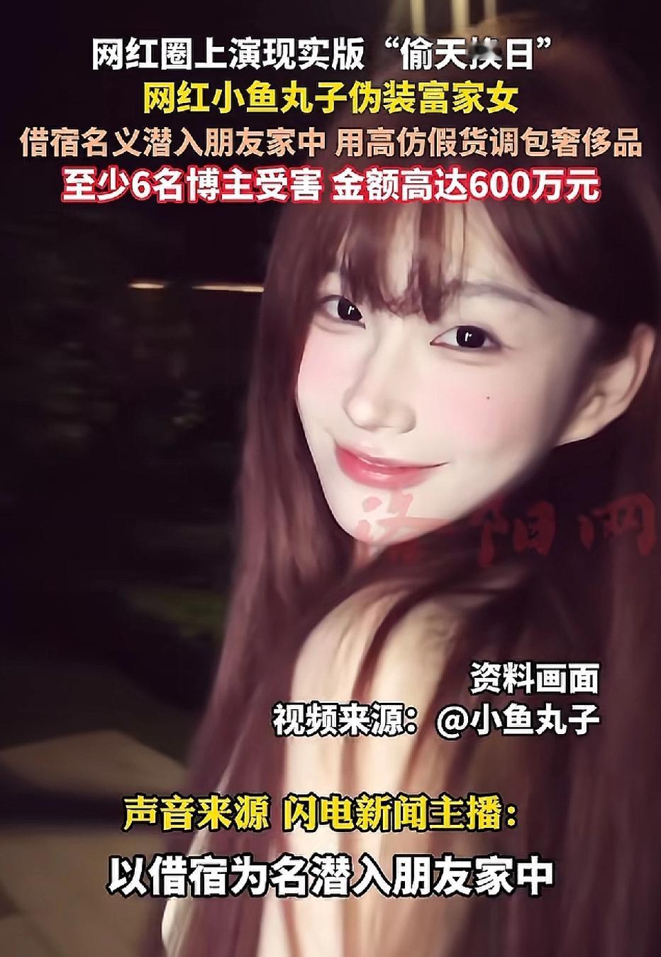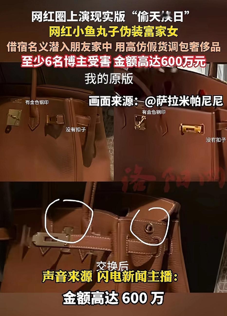 女网红“小鱼丸子”借宿朋友家中,竟盗取朋友们的名牌包包拿去售卖,涉案金额高达600万。 目前已有六位网红报案。 “小鱼丸子”是02年出生,今年仅23岁。 她平日总以富家女形象示人,朋友们对她毫无戒心。 此前,她先留意朋友们包的款式,然后购置同样的仿冒品。 每次借宿时,她都会带一个大行李箱,里面装着仿冒名牌包。 趁朋友睡着,她就将真包换成假包。之后通过二手交易将真包售出。 有网友称:小鱼丸子从高中就开始偷窃,比如同学的饭卡,AJ鞋子等。 这是否,又是一场网红的联手炒作呢?目前,被偷的几位网红直播间很是火爆。 做网红不是挺赚钱的吗,为何要去偷别人的名牌包? 看样,不接受朋友的借宿,也是自我保护的一种方式。 正值大好年华的她,却走上偷窃歧途,实在令人惋惜。 涉案金额又如此惊人,往后至少要付出十年的光阴,为偷窃行为买单,这样做究竟是否值得? 来源:闪电新闻