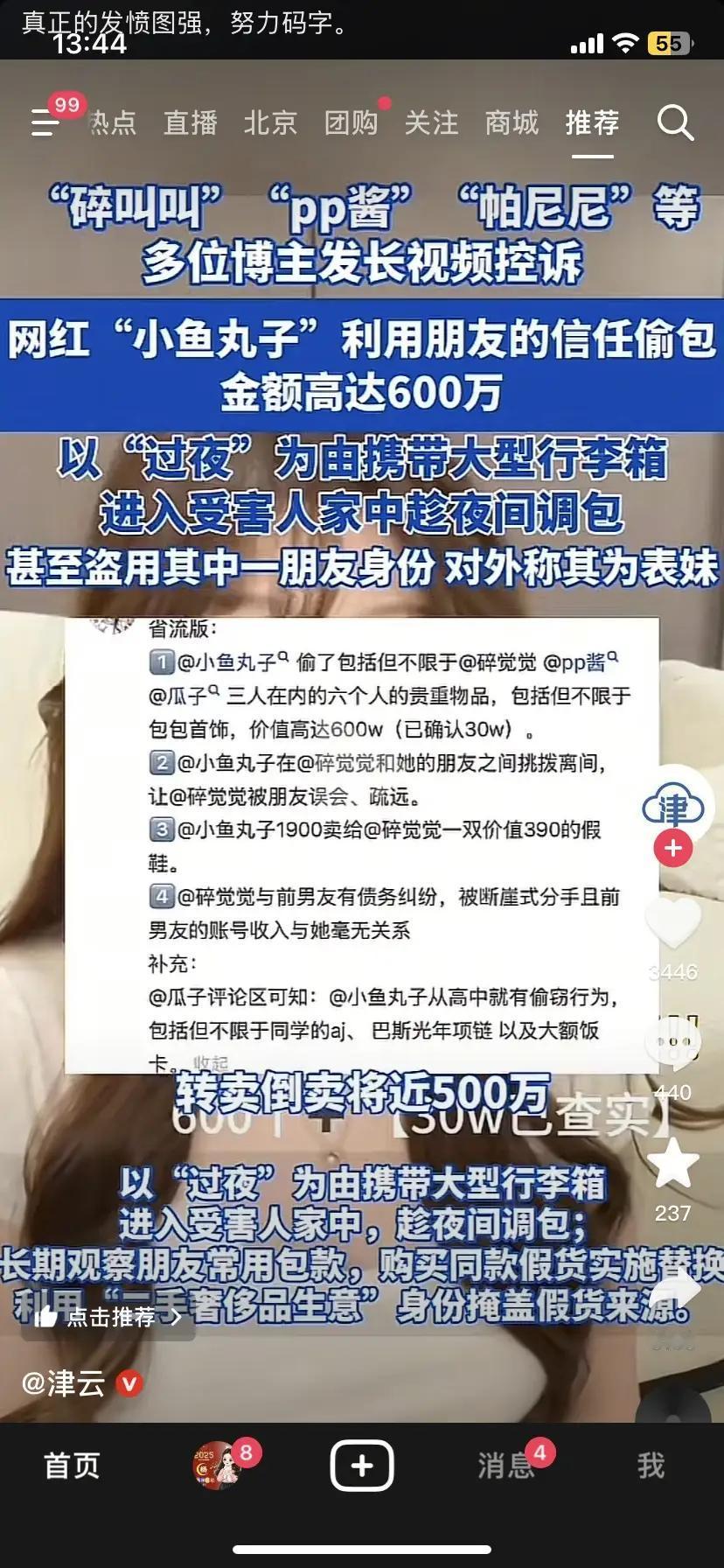 女网红“小鱼丸子”借宿朋友家中,竟盗取朋友们的名牌包包拿去售卖,涉案金额高达60