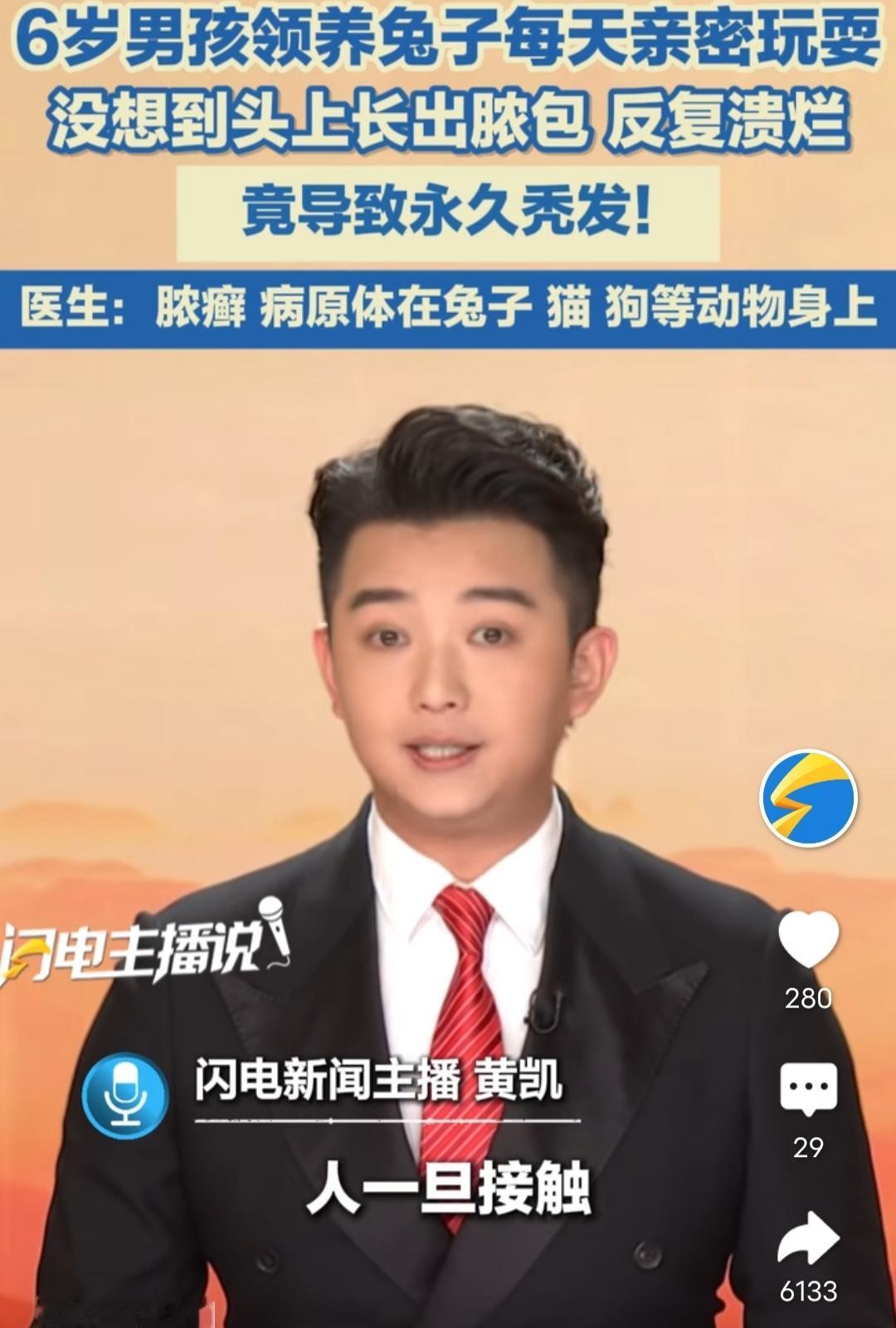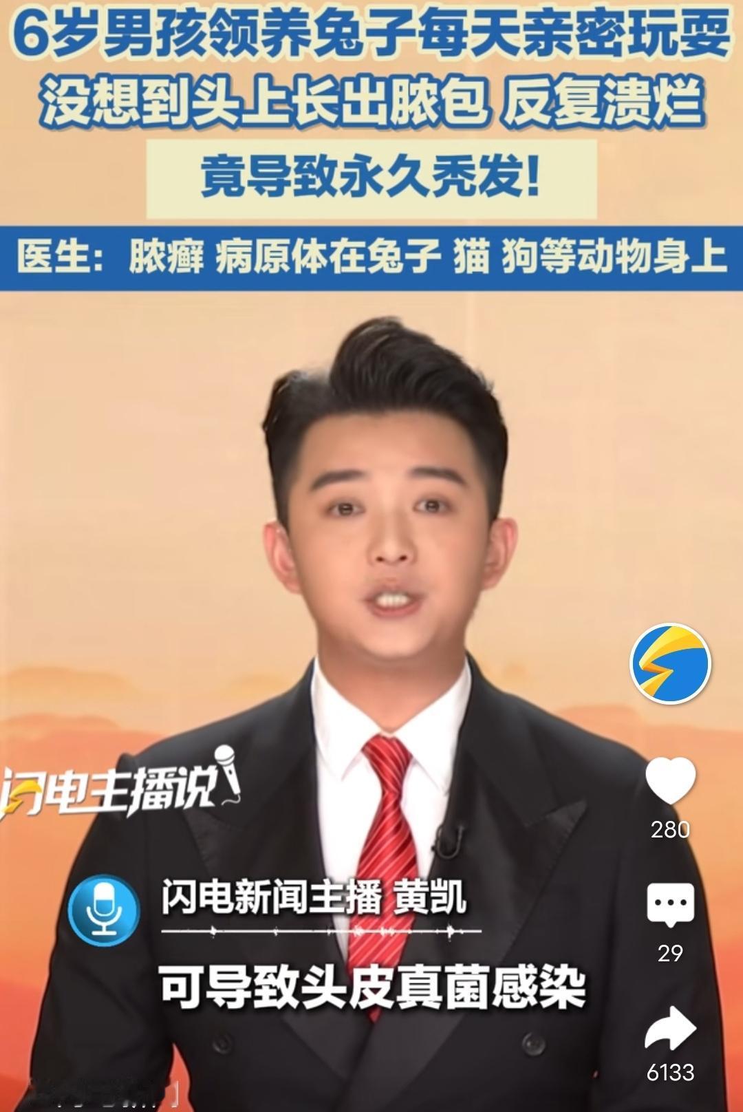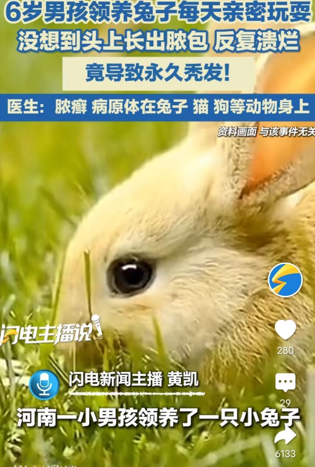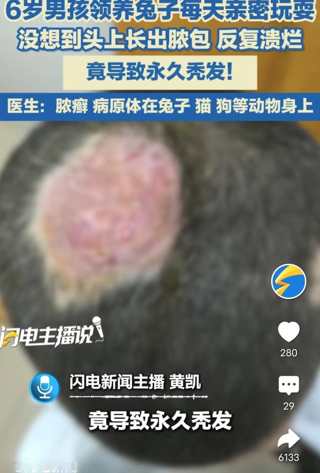 6岁男孩领养兔子每天亲密玩耍 没想到头上长出脓包 反复溃烂 竟导致永久秃发! 相关媒体报道,河南一六岁小男孩领养了一只小兔子,每天跟小兔子亲密玩耍,不久后孩子妈妈发现孩子头顶部有个脓包,后来脓包慢慢变大,还反复溃烂,导致那一片区域秃发了。医生说他这是典型的脓癣,就是小兔子身上携带的一种真菌导致的感染。虽然经过之间小男孩的头皮伤口愈合了,但是那一片却永远长不出头发了。 像小兔子,小猫小狗等这些小动物身上几乎都携带有这样的真菌而不发病,但是因为种属不同人一旦接触就容易感染,所以医生建议有5岁以下儿童的家庭最好不要养宠物。 看到这样的脓包真的很影响舒适度,心里会莫名烦躁,可能我天生对毛绒过敏,所以,我家坚决不养小动物,小宠物,我理解很多人天生喜欢小动物,所以人各有志,我尊重每一个人的喜好,但是我对于那些跟猫狗啦什么的嘴对嘴亲吻的人实在理解不了,还抱着睡觉啦什么的也接受不了。毕竟人和动物还是要有区别的吧,毕竟种属不同啊,我也爱护小动物,我对善良乖巧的小动物也充满爱心,但是我是属于远观而不会近玩焉的。