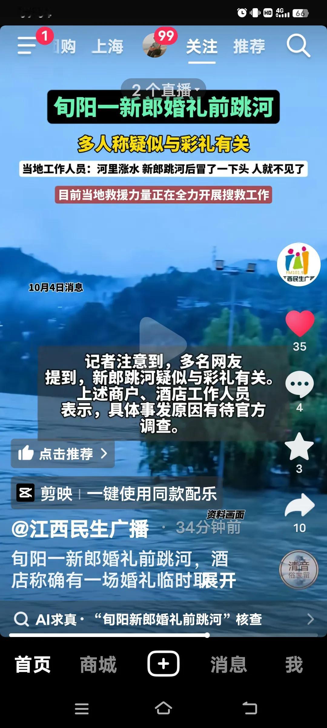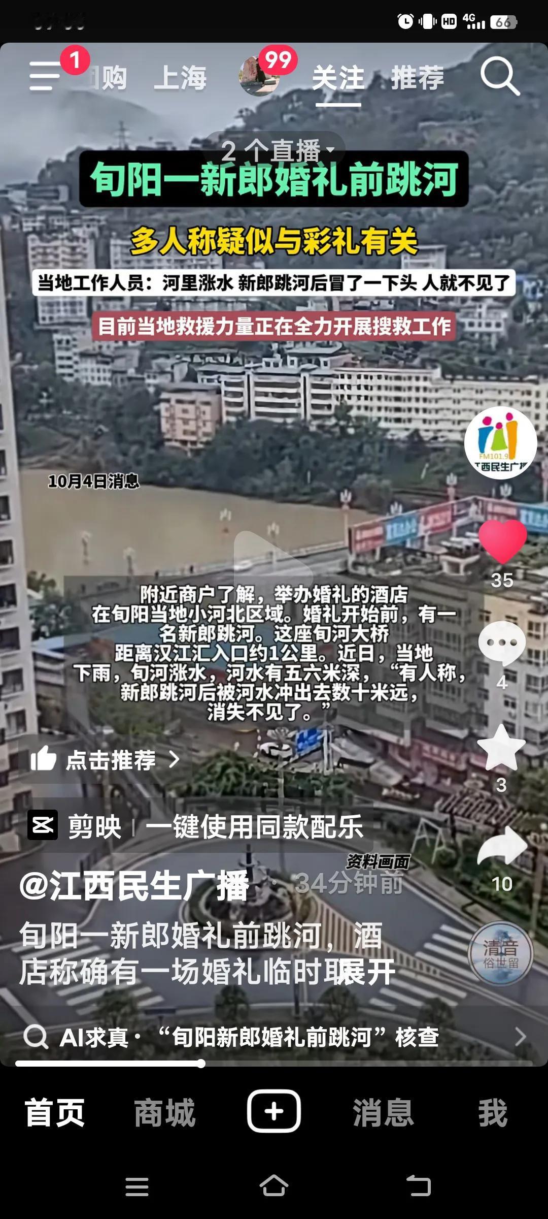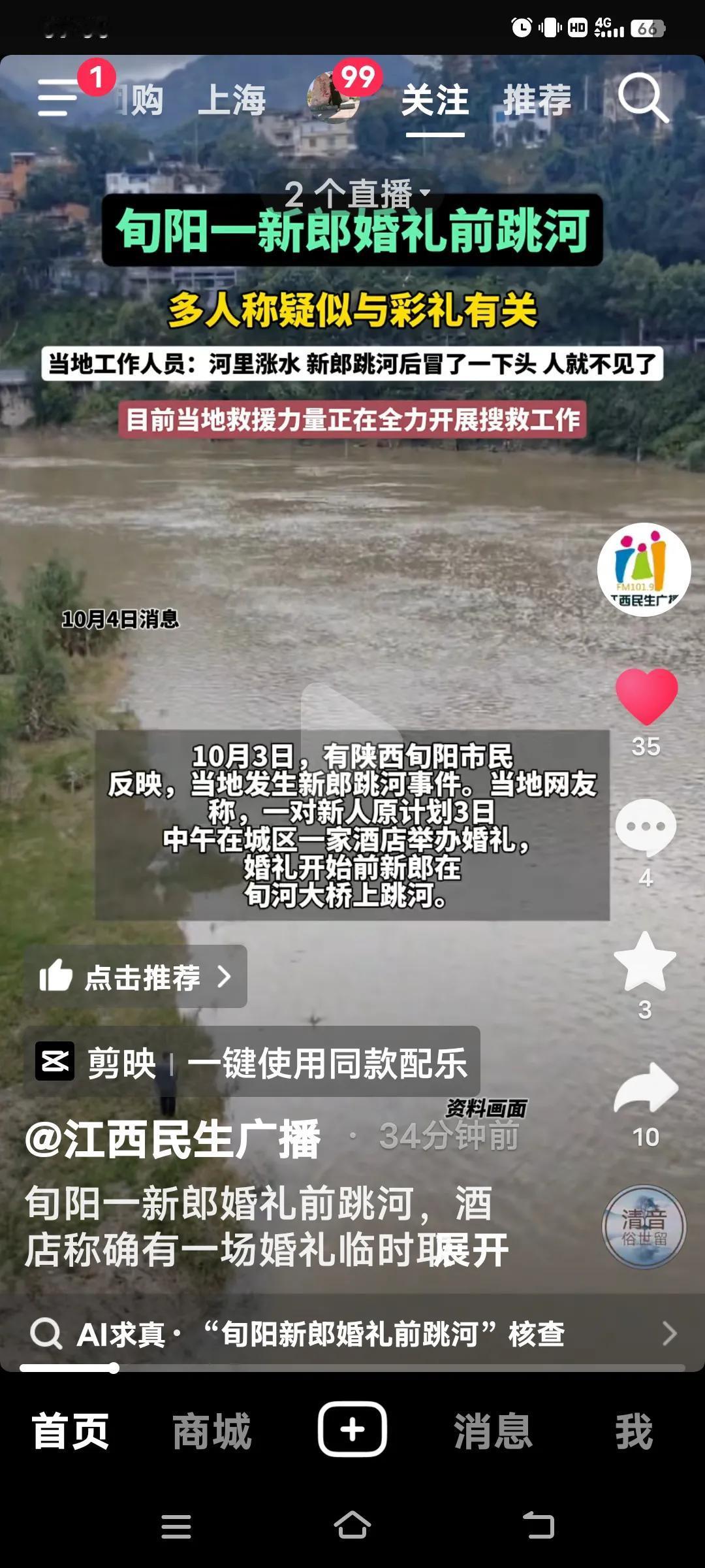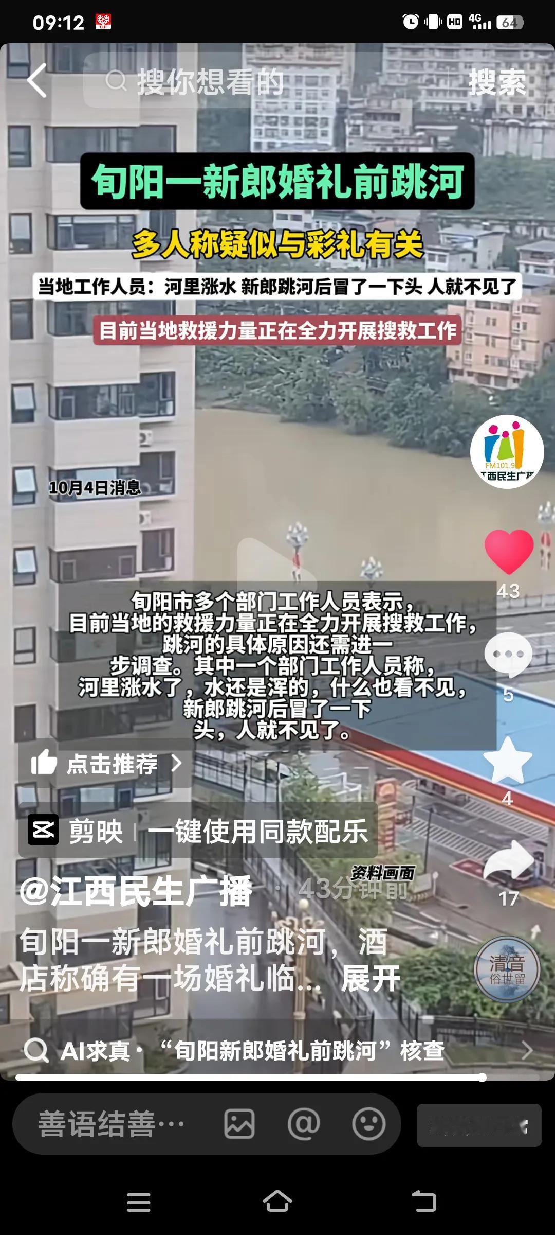 10月3日,陕西旬阳发生了一件令人揪心的事。一对新人原本计划中午在城区酒店举办婚礼,然而,就在婚礼开始前,新郎竟在旬河大桥纵身跳河。 有人称新郎跳河后被河水冲出数十米远,很快便没了踪影。 由于近日降雨,旬河水位上涨,河水有五六米深,其中有一个工作人员称,河水因涨水变得浑浊不堪。新郎跳下去就冒了一下头,人就不见了。目前,多个部门已展开搜救工作,救援力量迅速赶赴现场进行搜寻。 网上不少人猜测新郎跳河与彩礼有关,商店工作人员也提及此事,但具体原因仍需等待官方调查结果。希望救援能有良好的结果,也期盼真相能早日大白。这无疑是一场婚姻悲剧,喜事变丧事。新郎一时冲动,却未考虑父母的感受啊!旬阳涨水
