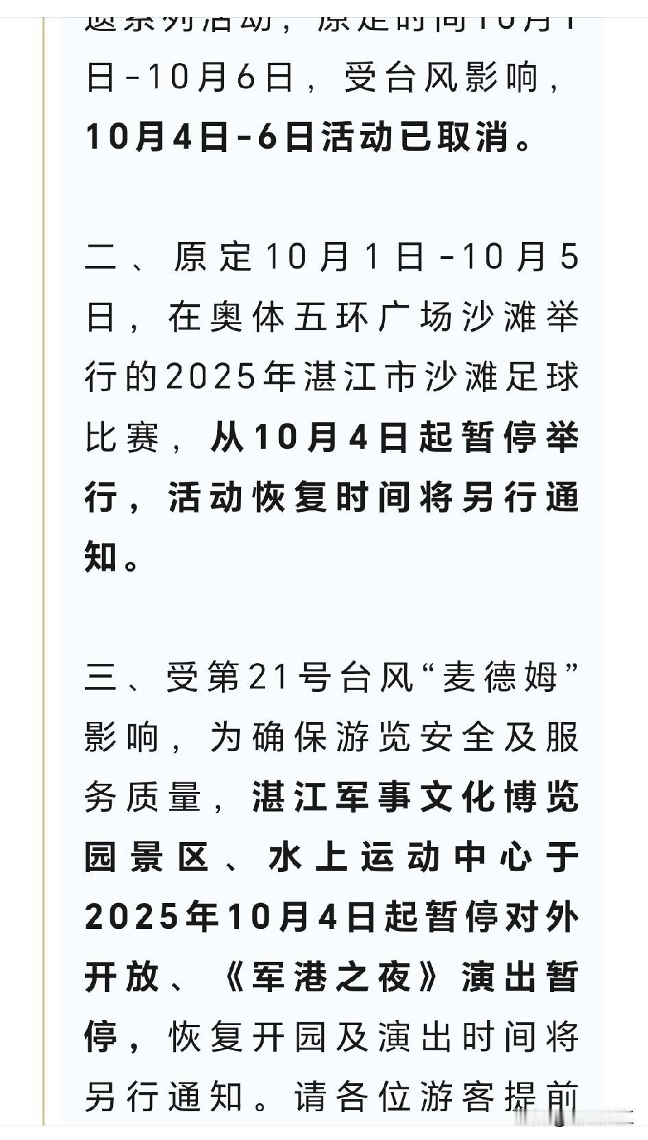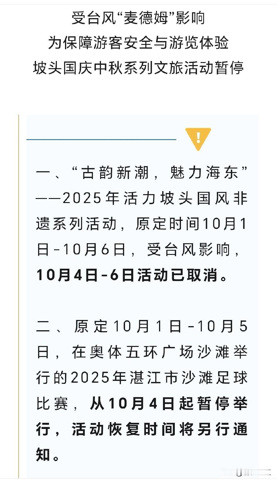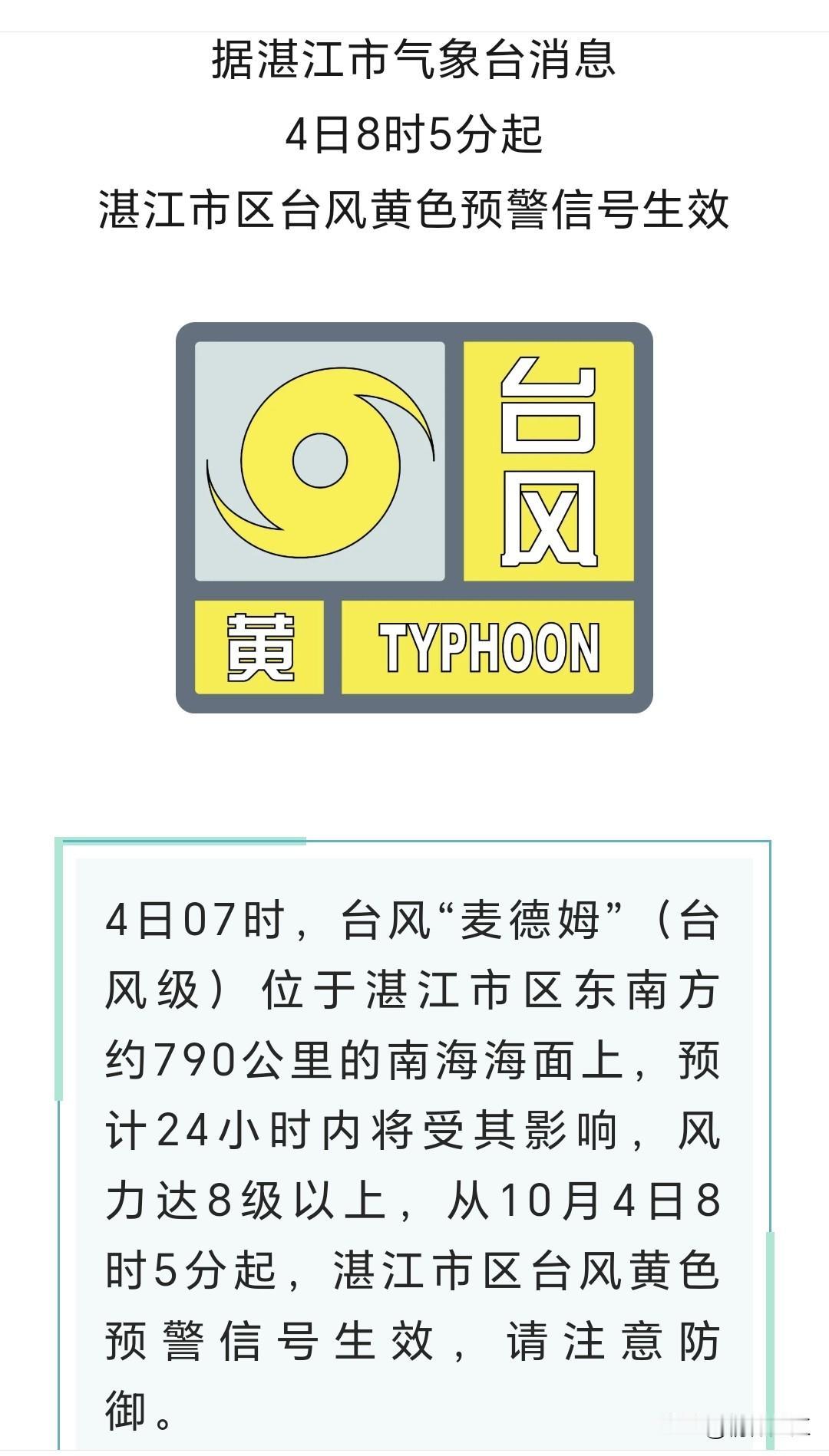 受到台风麦德姆的影响,湛江市区台风黄色预警信号生效!好在目前是国庆假期放假期间,否则学校就要停课了。但是影响更大的是湛江的旅游业,假期刚好过半,就要暂停了,本来假期湛江的旅游区客流挺多的,原来的赚钱预期就改变了。真是人算不如天算啊!