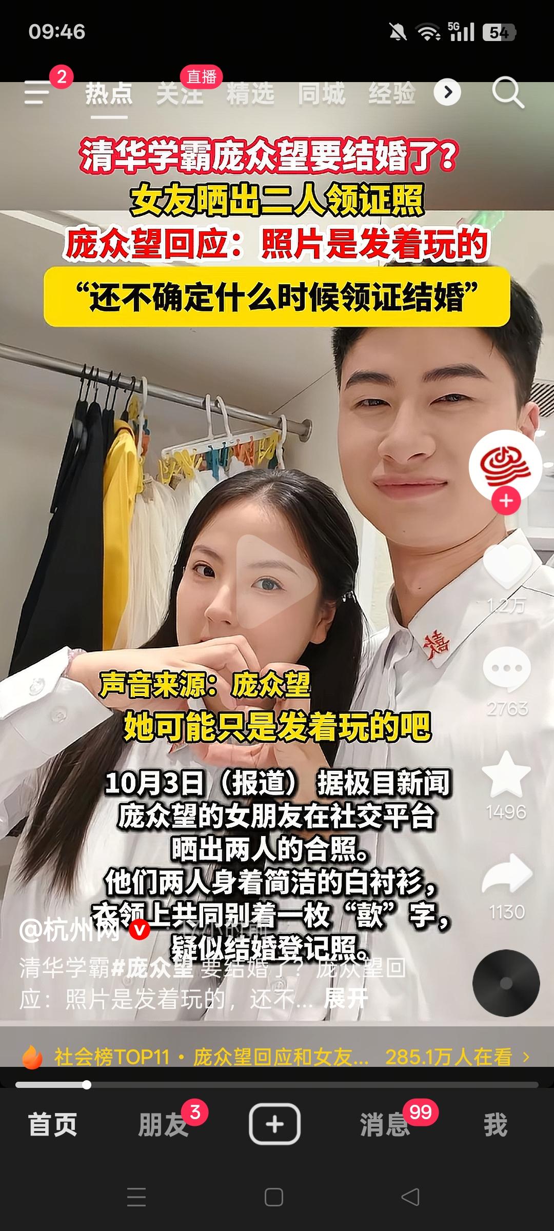 国庆的婚期已到,好多都忙碌着筹备。其中网上在发庞众望和女友结婚了,他女友晒甜蜜合照。 二个都是高中同学,相知相识是最完美的,听说:一开始不怎么看好庞众望的,但人家可是清华学霸,你们认为还有什么能让一个人奋发向上的,那肯定是离不开有个好家庭的,还有他喜欢的人啦! 庞众望回应大家,还没确定领证时间,说明已经快了,希望他和女友早日修成正果。清华学霸庞众望要结婚了吗
